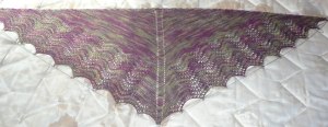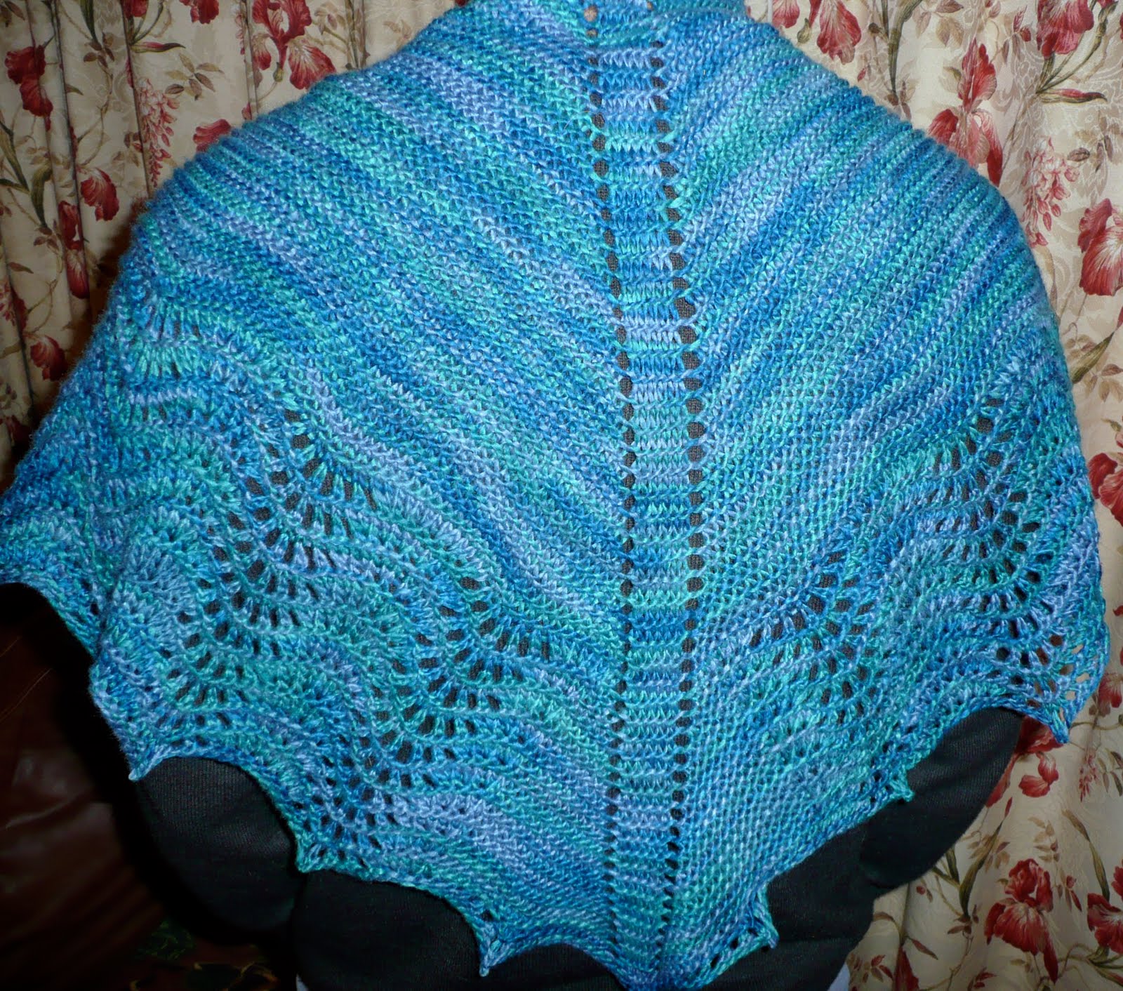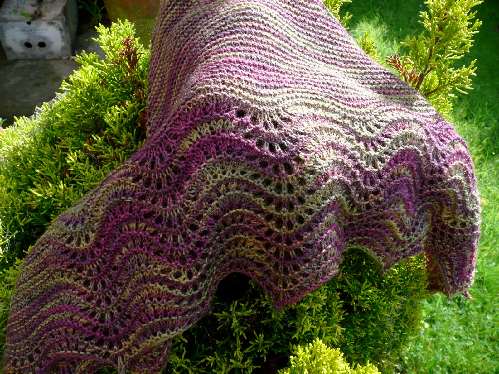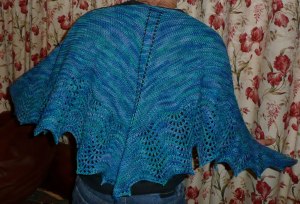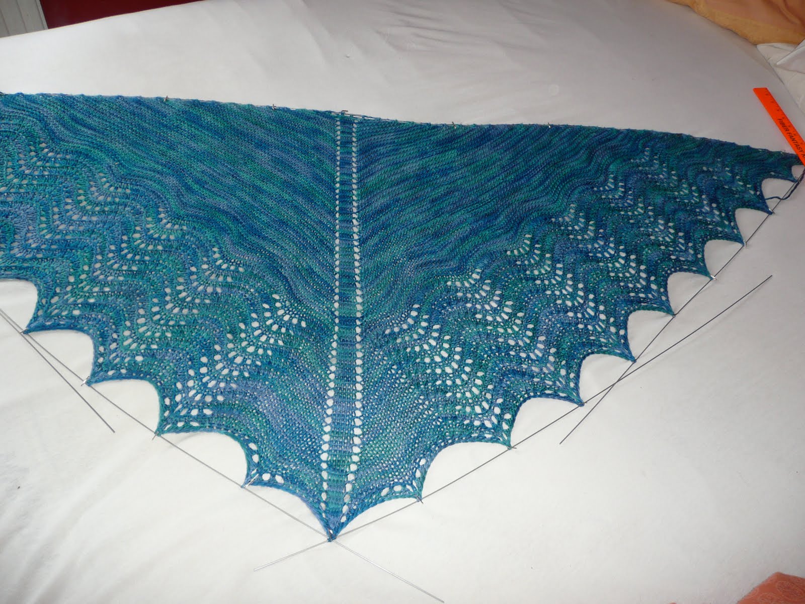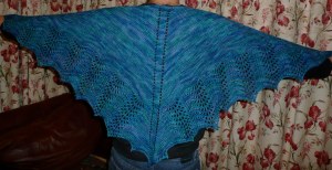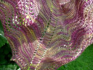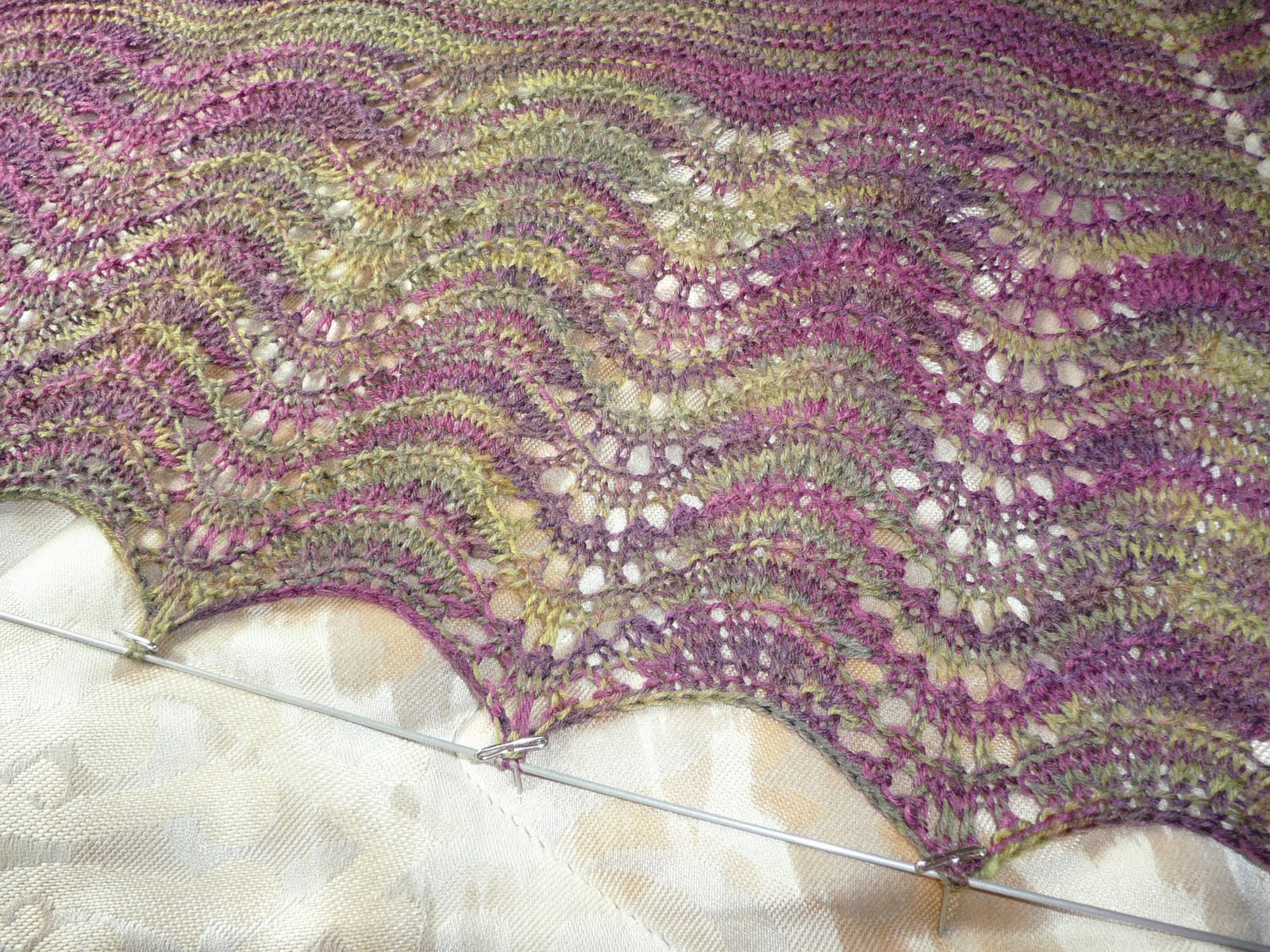 Fast forward to this morning when I next picked up my shawl. And started on the tricky row which involves counting to six. At the half way point I realised there was an error, I was one stitch out. And as I say the feeling of dread came over me. Had I made a mistake during the previous evening? So, I counted the sixes, backwards and forwards over the row. I counted them several times, then I switched on my side light next to my chair and counted them a couple of times again. I carefully stretched out that half, a section at a time to see if I had dropped a stitch. I looked again to see where the pattern changed that showed the error, and thought I could identify it where it had, but couldn’t find the error in that area.