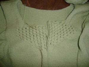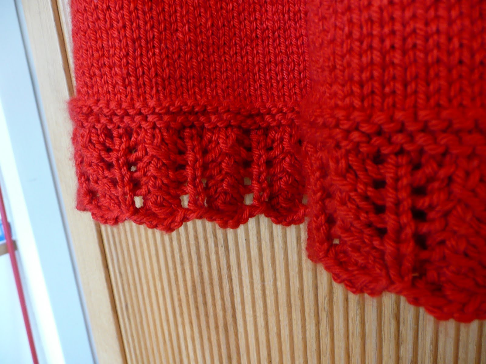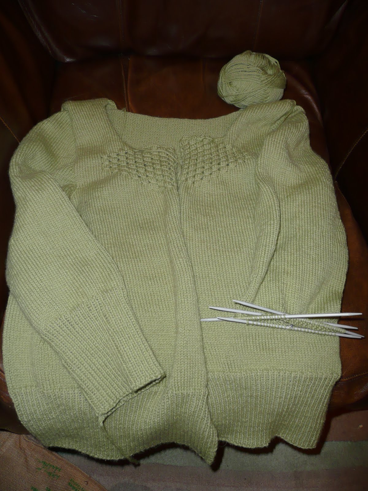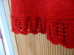 There are lots of nice little details on this cardigan, the twisted long ribs and the decorative lace to name but two. It is knit in the round and has an unusual way to attach the sleeves, which I liked, its a very nicely written pattern. Another week’s knitting and finishing and we should be there. I’ve knitted it on the smaller of me side so that I shrink into it!