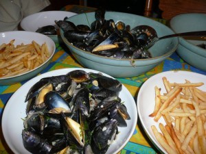 They were clean, tasty and very plump, and came all the way from Cornwall. They say mussels should only be eaten with an R in the month, but modern methods mean you can have them all year around, my self, I think they need the cold to plump them out and recover from breeding. From November to late February or March if the weather was like last years is the perfect time for mussels. And what could be better in the dark and dismal days of winter in landlocked Warwickshire than the smell of the ocean tantalising your taste buds as well as your memory. And then just for good measure adding the tang of a splash of malt vinegar and a little sea salt on your hot crispy chips, making it tricky to decide which mouthful to have next, the crispy, hot, salty with a whiff of vinegar chip or a plump, fat, mussel dripping with a buttery, winey, slightly garlicky liquor accompanied by the clean fresh ozone smell of a winters day walking on the beach.