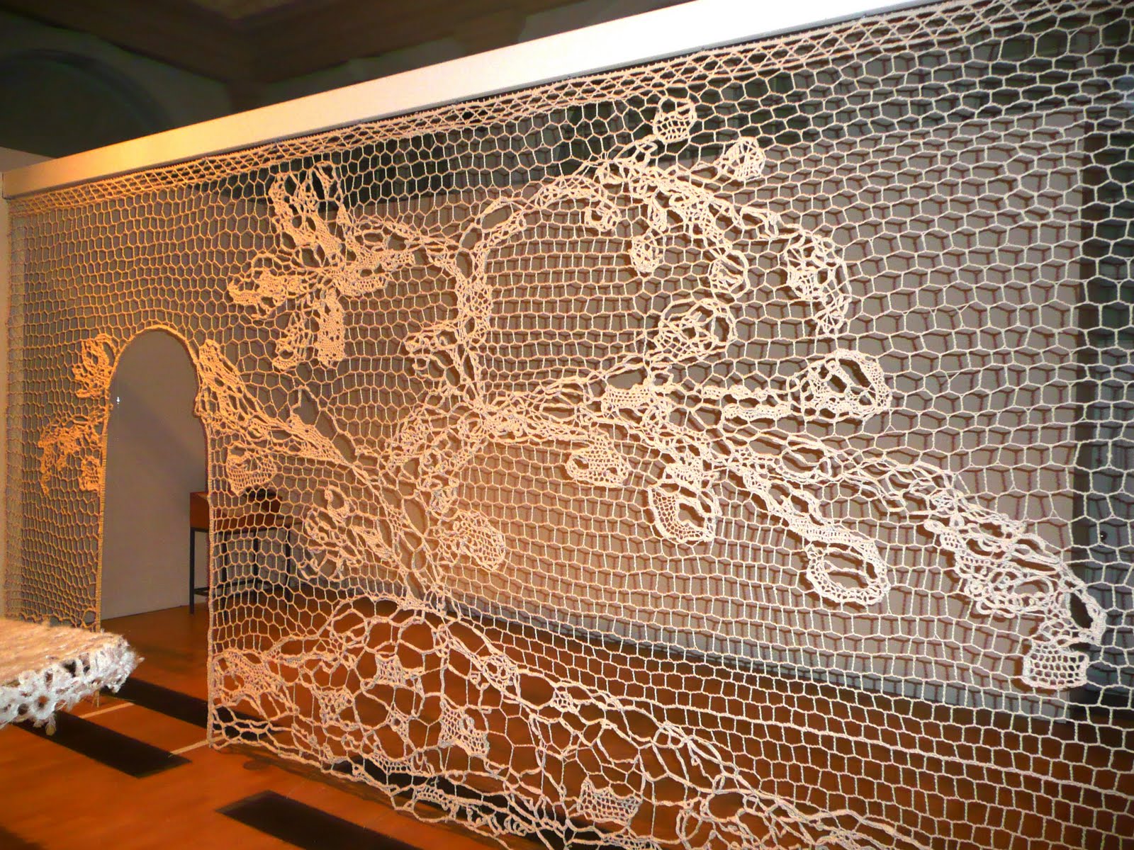 Last Friday we trotted over to Birmingham to see the Lost in Lace Exhibition at the Birmingham Museum and Art Gallery. For the first half an hour we stayed firmly entrenched in hubby’s car as the rain drops were so heavy they were bouncing up six inches after they had hit the pavement. Eventually we got into the museum, the boys went off for another look at The Staffordshire Hoard whilst I had a look at the lace. This gave me the time that I find is necessary to slow down to a pace which engages the arty side of my brain. I rather like it when I can just, if I listen very carefully, hear my own breathing, rather than the clod hopping sound of a boisterous teenager bouncing around a wooden floor whilst making audible sighs as to just how long his mother is going to be. It gave me time to appreciate the art of lace on a completely different scale.