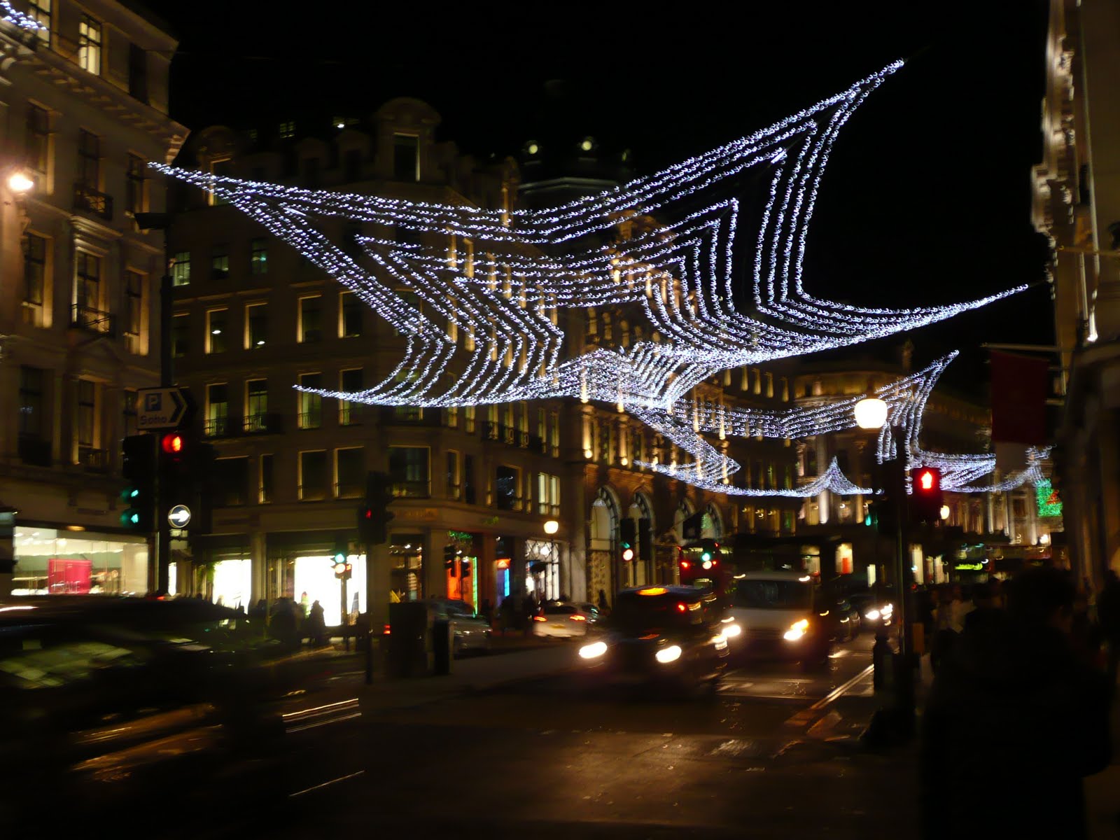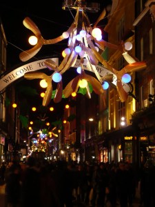 Carnaby Street, viewed as one of the best displays of Christmas lights by Time Out, London. Oversized mistletoe chandeliers with berries that change colour in time with the music. They were fun.