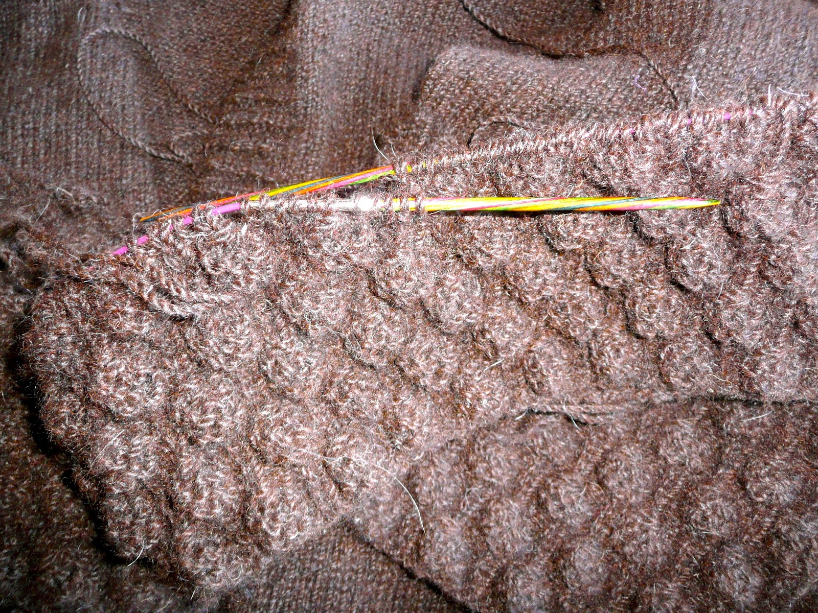 I love the depth of colours in this yarn. It is not dyed, it comes straight from the Alpaca and if you look carefully at the yarn you see rusts and golds interwoven with browns and reds and blacks and the odd fleck of white hair that has gotten into the mix. I love it, it is just so me.