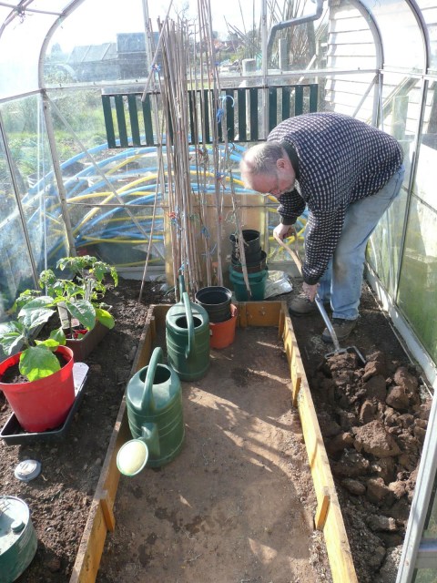 Hubby is trying a different method for the tomatoes this year. Rather than using grow bags he is building raised beds in the greenhouses and filling with our own home made compost. We will have to see what happens. This year we are using a combination of tomatoes grafted onto vigorous root stocks and tomatoes which are not. We couldn’t get grafted large plum tomatoes so we decided on the usual plants. I’ve found that these are the most delicious when pulped down for cooking and the easiest to pick, much quicker than picking the tiny tomatoes and the quickest to blanch, skin, chop up and cook.