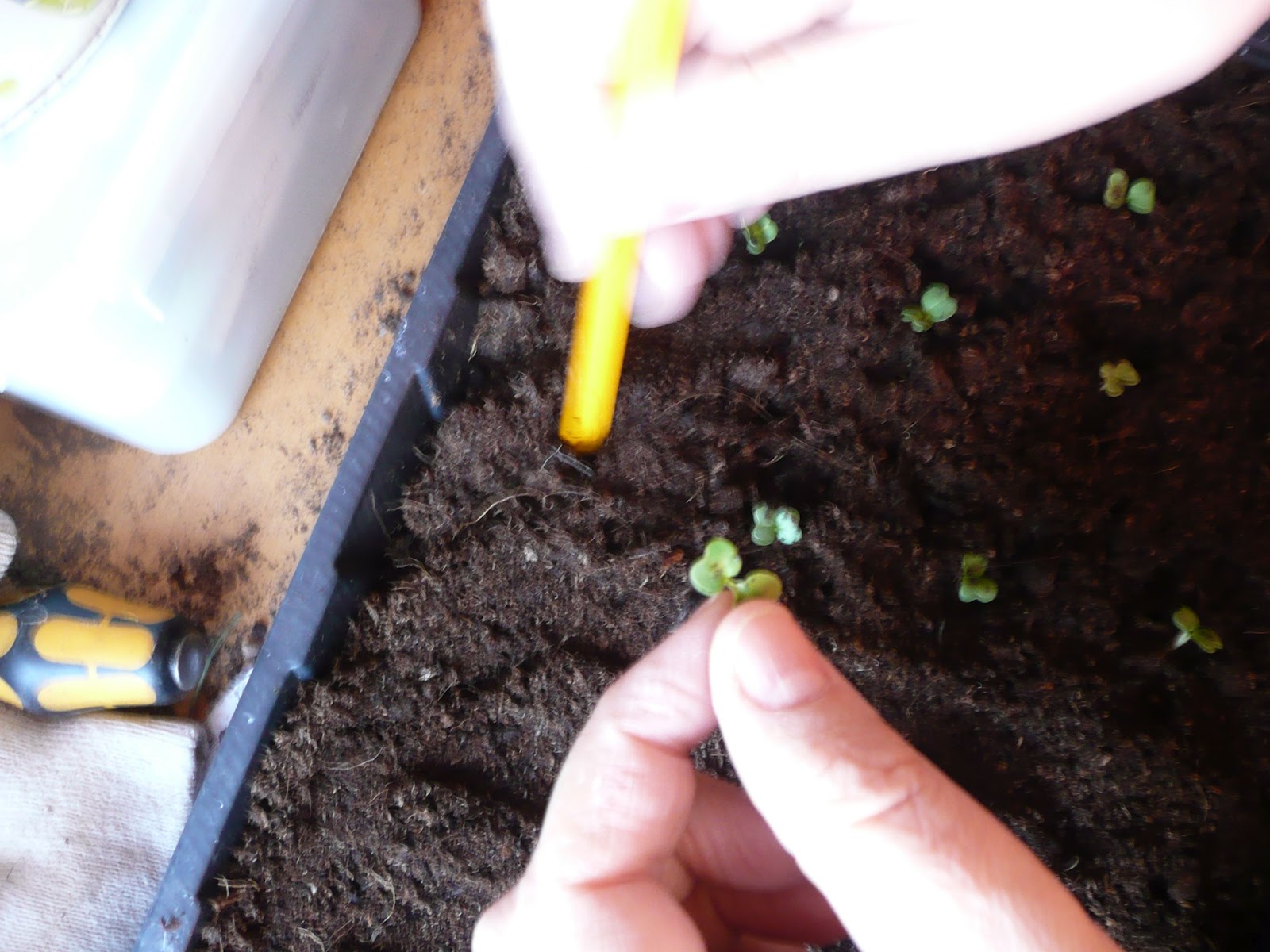 I find using pencils are the best way to prick out, I hold the leaf, never the stem, no matter how gentle you are you risk damaging the plant if you grip the stem. I use the pencil to lift the plant and its roots gently from the soil (no pencil in this shot as I was taking the photo with the other hand)