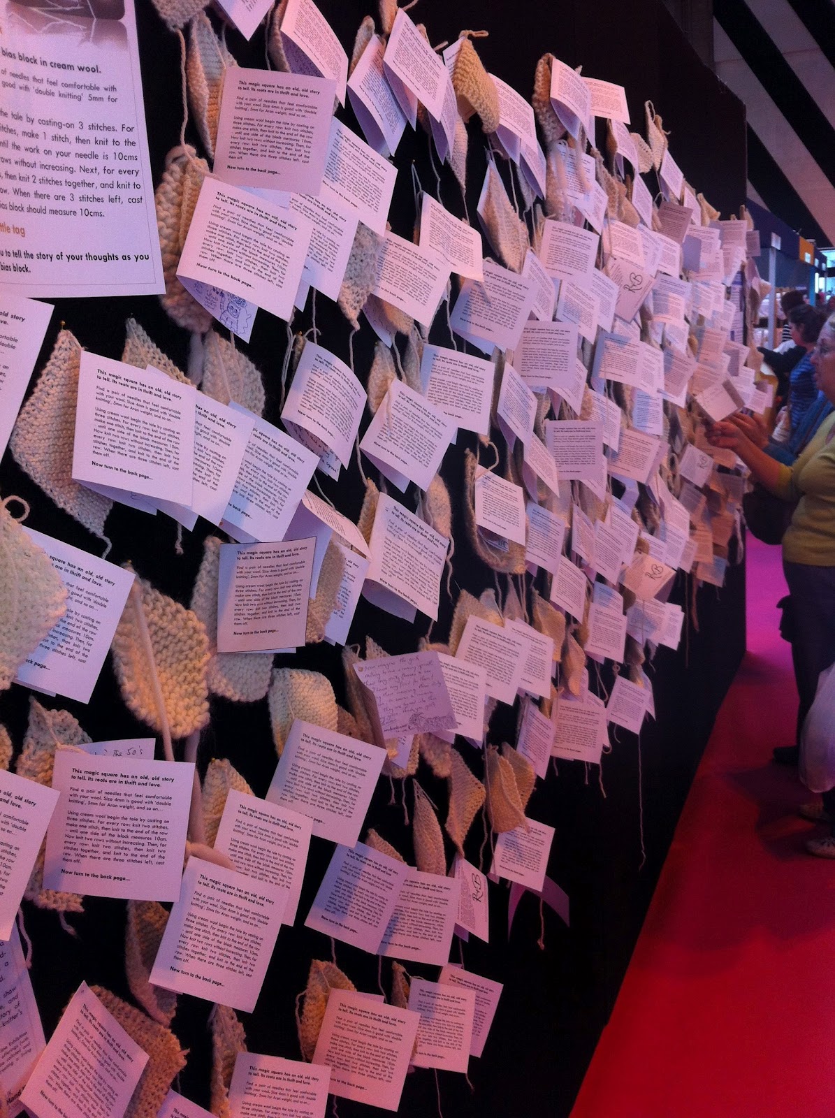 The wall at Sunday lunchtime, over 250 bias blocks were knitted in the four days, Belinda and Ruth are hoping for a million! So if you fancy joining in, go for it, I am sure it is going to make a wonderful art installation in the future. Belinda is talking about using it to festoon Tower Bridge with, I like a girl with vision.