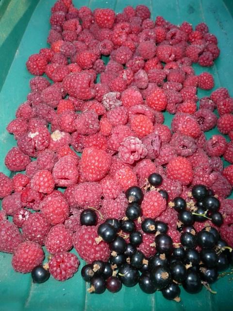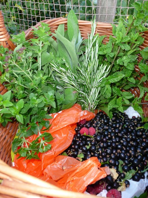 Blackcurrants, raspberries and cherries (buried underneath) and mint, sage, rosemary and oregano. There is only one way to pick blackcurrants, sitting on a chair. The pesky little things hide really well and it takes me a good three quarters of an hour to find all the fruits off one bush.