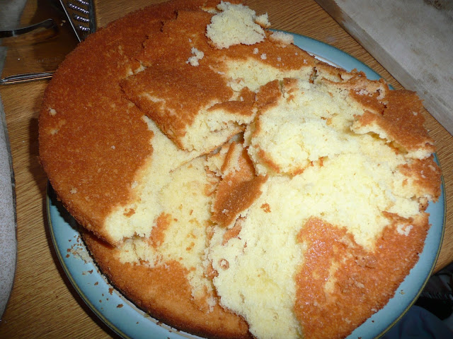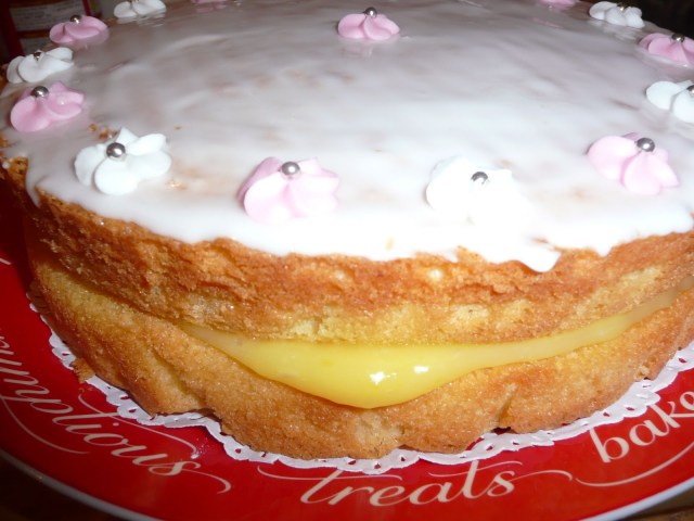 Then I had an epic fail, I was using new tins and had thought that I wouldn’t need to line them, that was a mistake. Started again very quickly and made another lemon sponge, had to send son no.1 out for eggs. I made the lemon curd in the traditional Mandycharlie way, shove everything in a pan together with some cornflour to stablise and bring up to a burbling simmer. One cake, pretty enough I think, but I still don’t know where I am going, and its five o’clock!