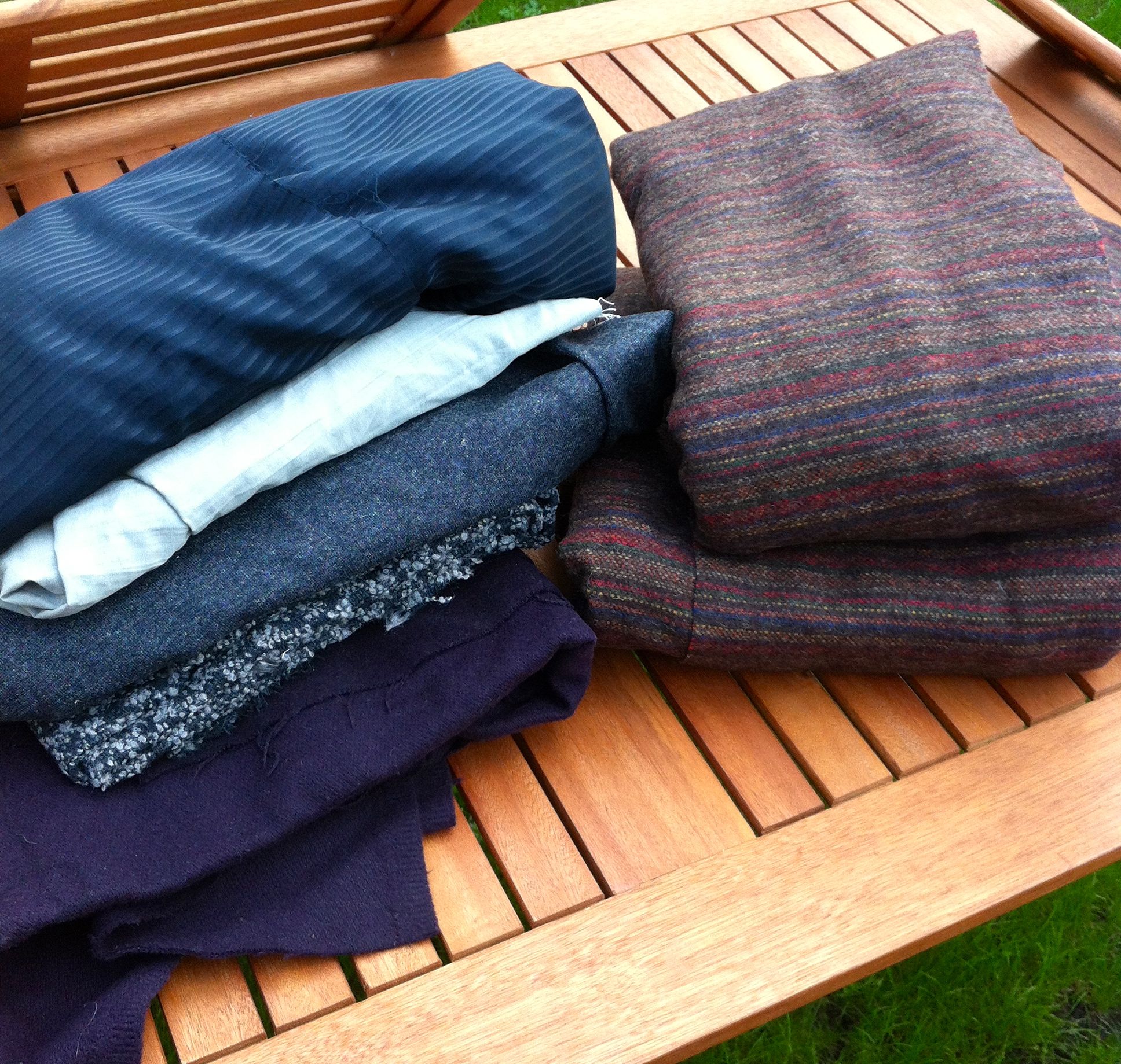 You see the above fabrics, three metres of silk, four of a heavy pure wool – two metres of cotton shirting, one metre of wool flannel, one metres of a wool boucle type thing, and one metre of a heavy wool, and there was something else you can’t see. £45.00 quid, approx the same price as one metre in Berwick Street.