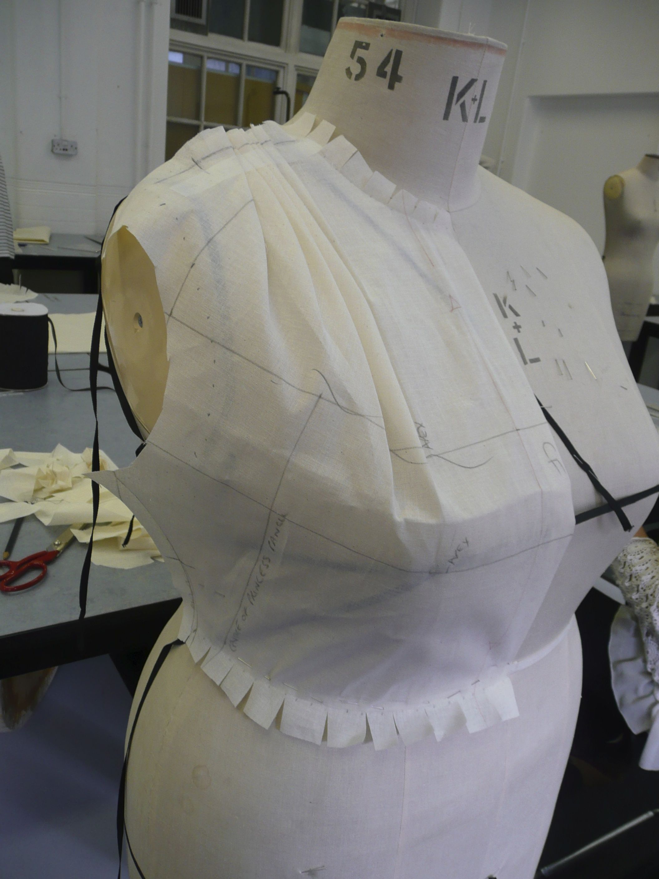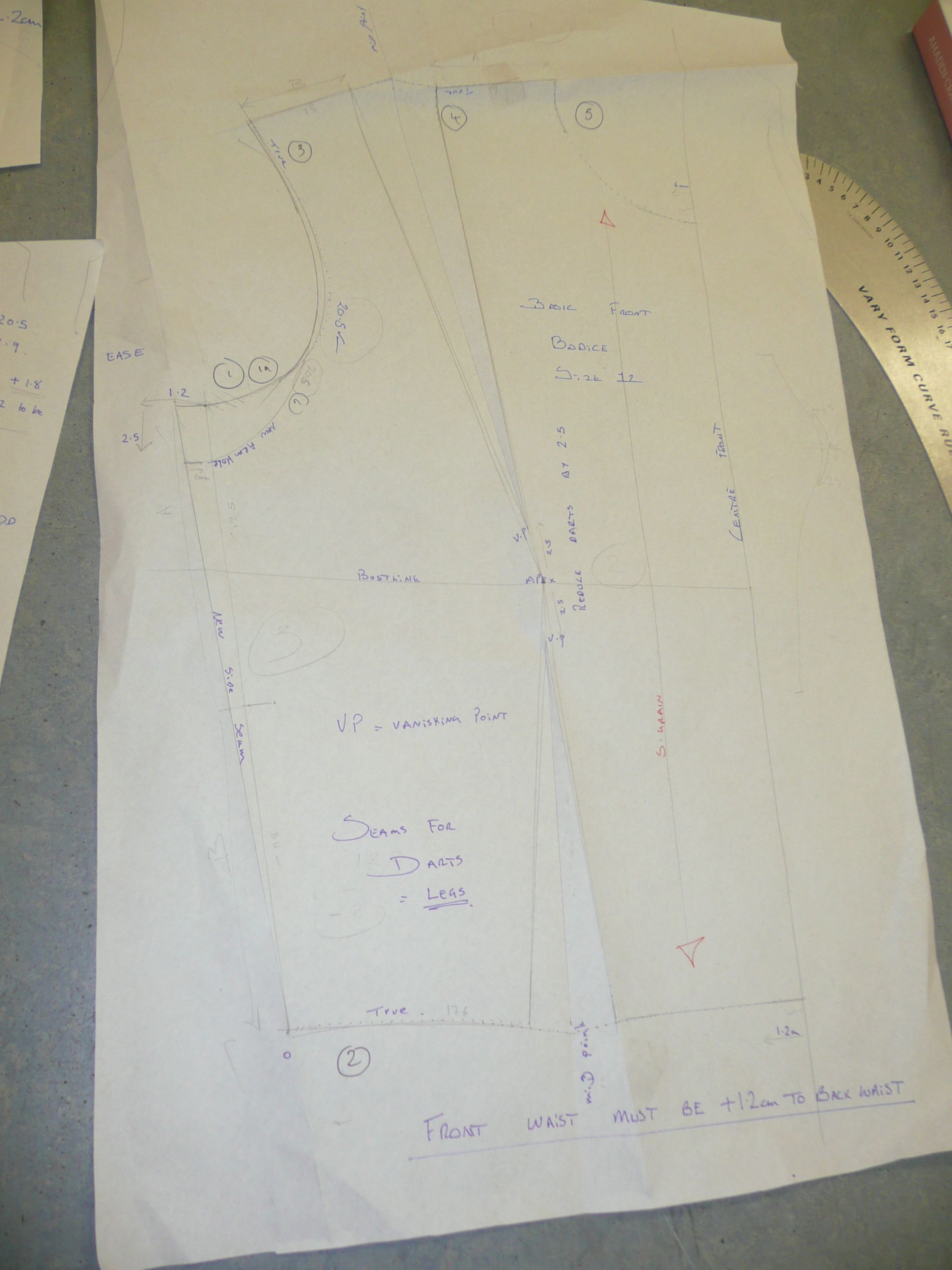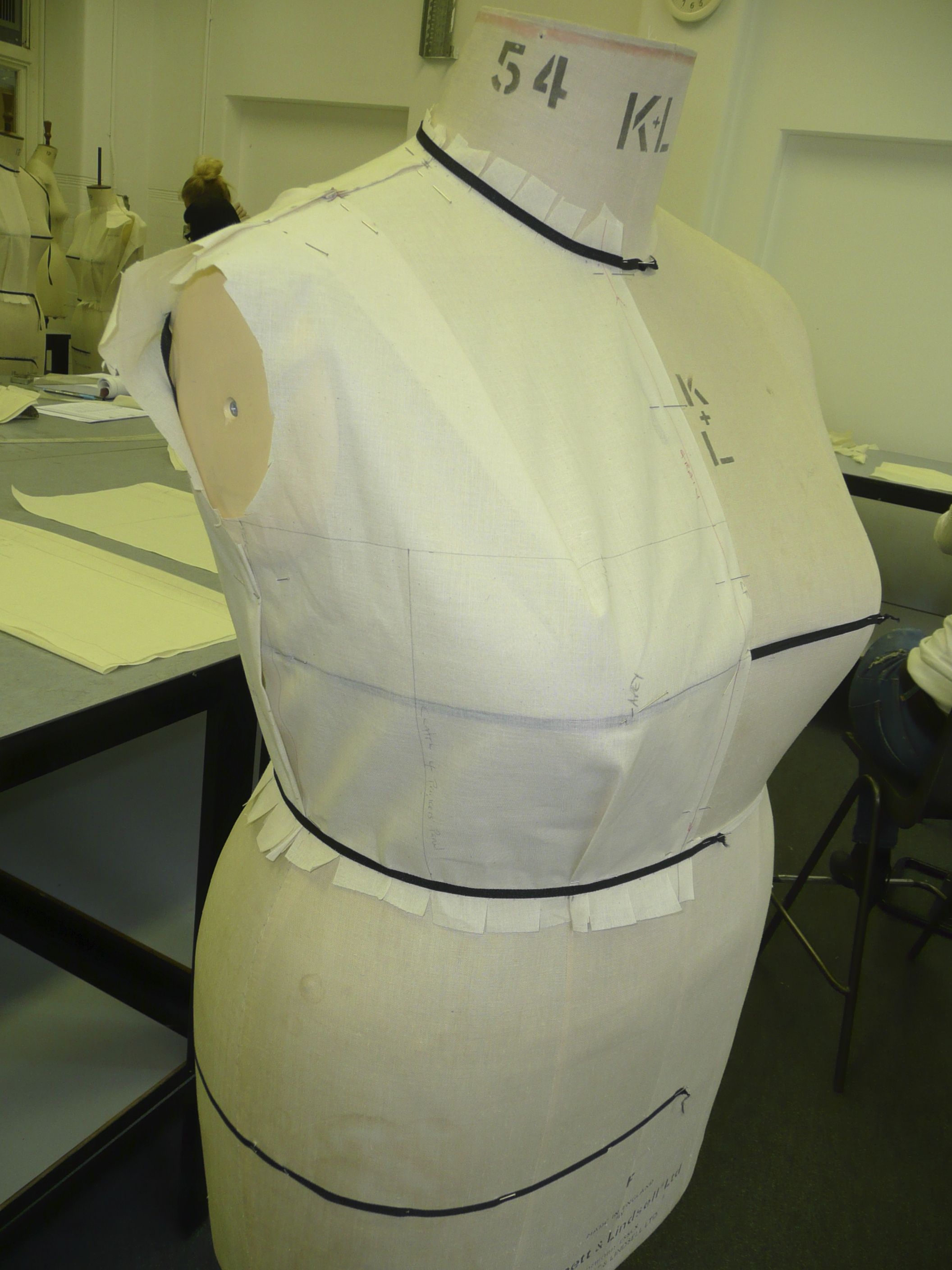 And again this would be transfered to make a paper block, then a pattern and then it would be toiled from the pattern to test it. And that stage will happen as many times as necessary before being tried on the house fit model and making final decisions with regard to your collection. There are certain aspects one would never trim until being tried on a house model, the top of the bust for instance, that will definitely move in a different way to a mannequin and to trim it now could prove a disaster.