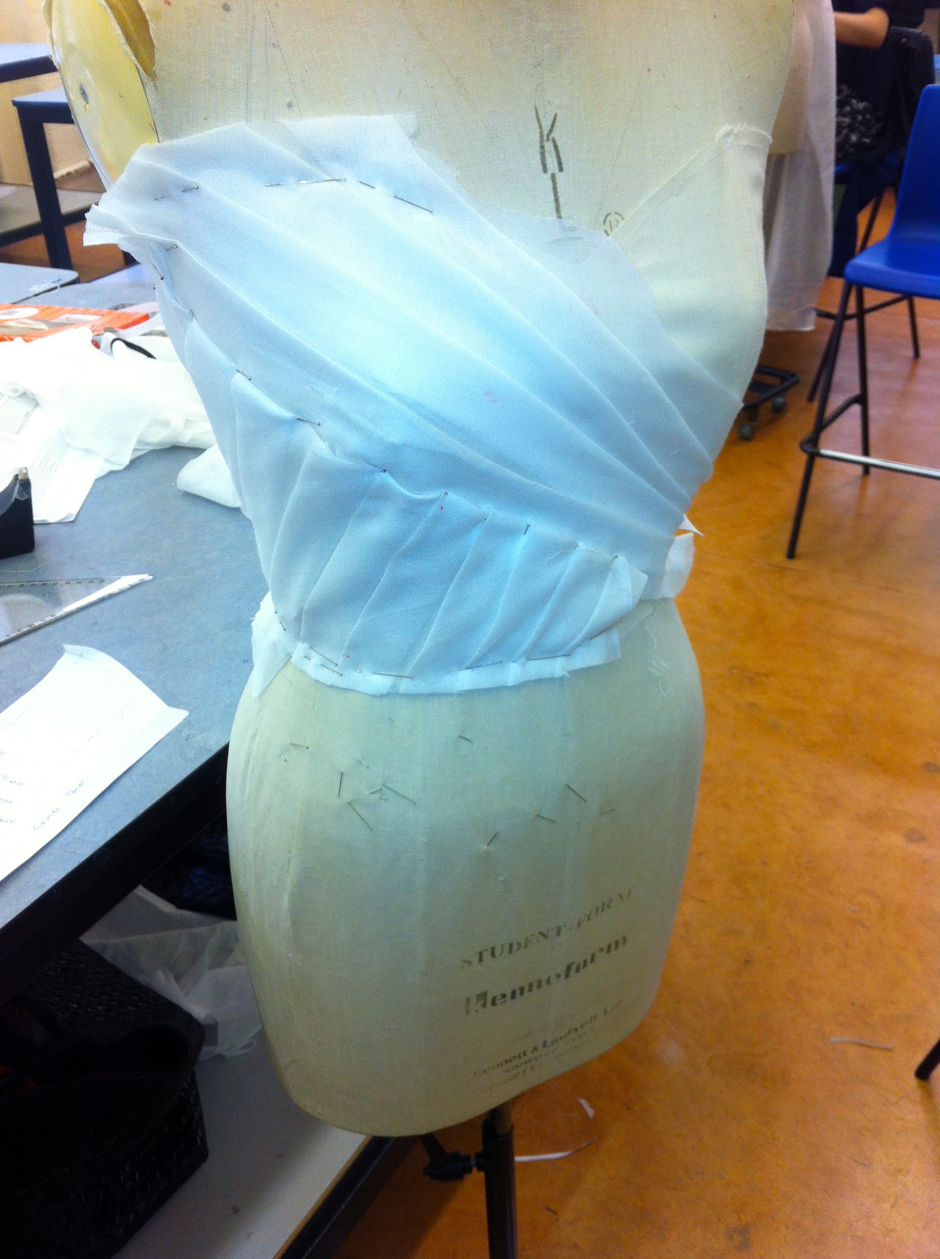 During my first year here at University I decided to take some extra classes about draping on the stand, it intrigues me and I want to make full use of any opportunities that come my way through extra courses taught by tutors at the UAL that I have either the stamina to attend, as well as doing my course work and can afford. This was a bit near the knuckle with regards to both finances and exhaustion levels, but oh so worth it. When your taught by the experts, they work you hard and I used to come out of this class knowing I’d done it, but loving every single second of it, even if I was crying for mercy one notable afternoon. This again is just a snap shot, it will give you a very quick idea of nine days work, of some, not all of the tops and skirts we attempted, I’ve lost the dress on the computer, if I find it I’ll slot it in another post.