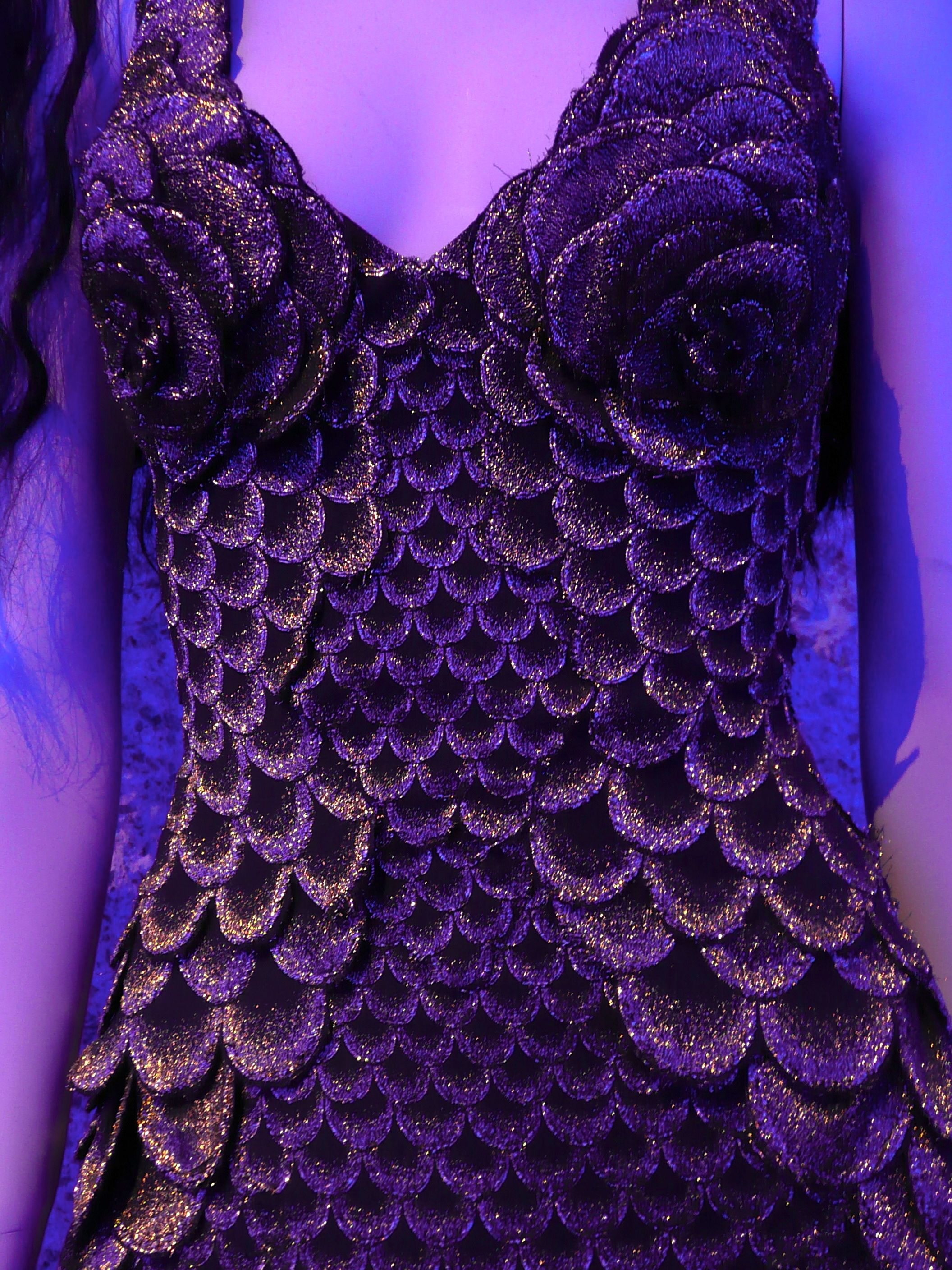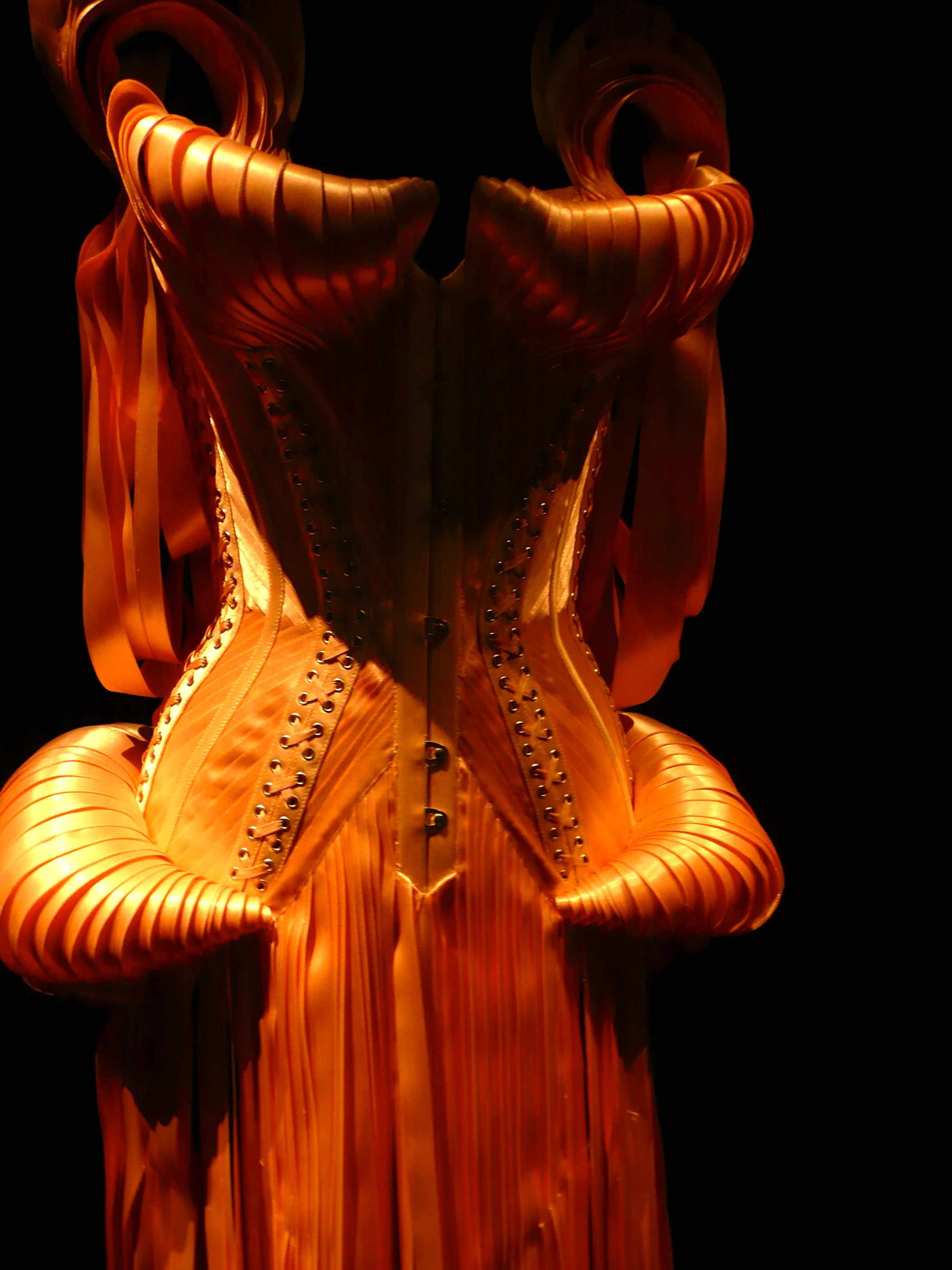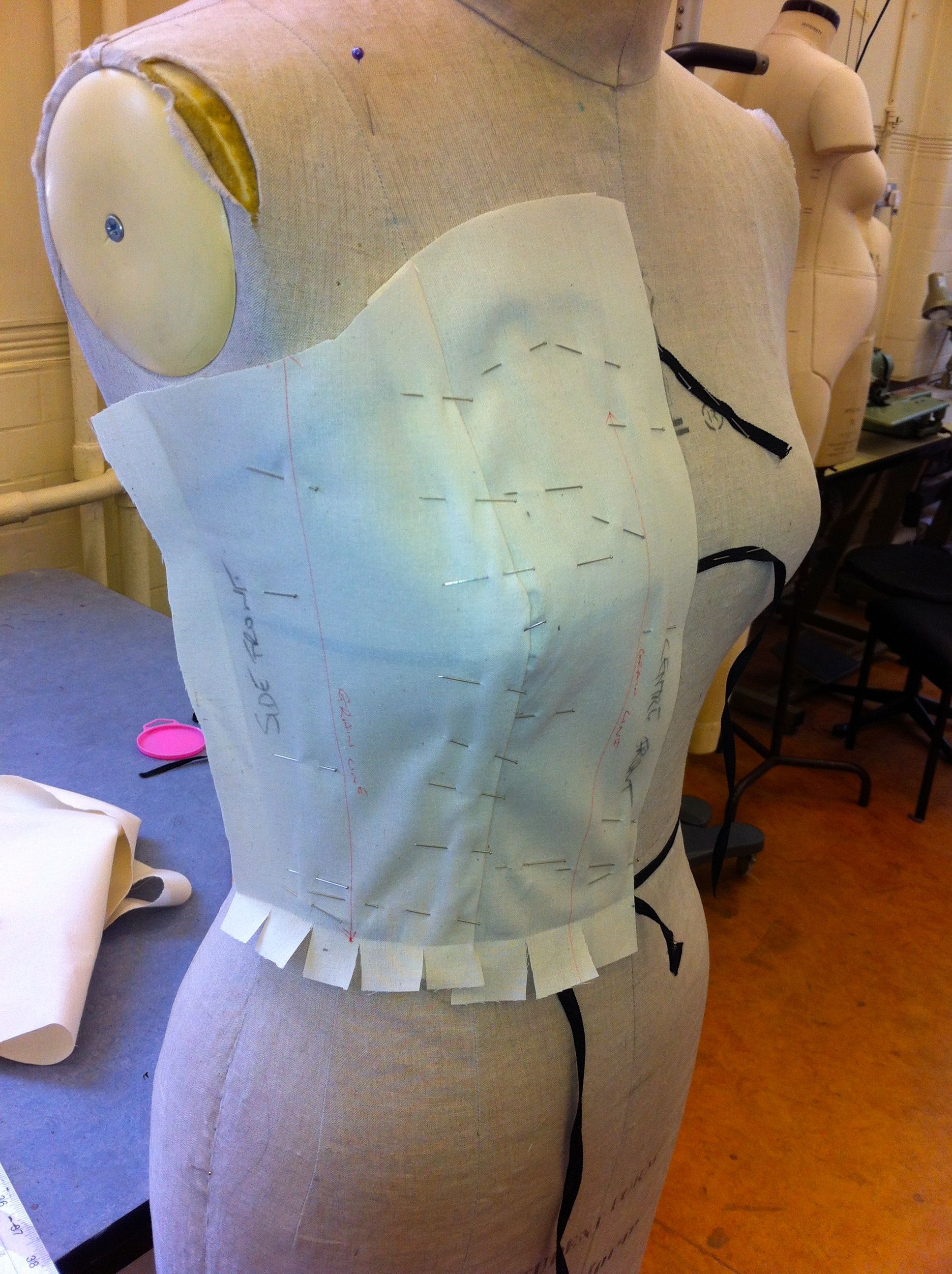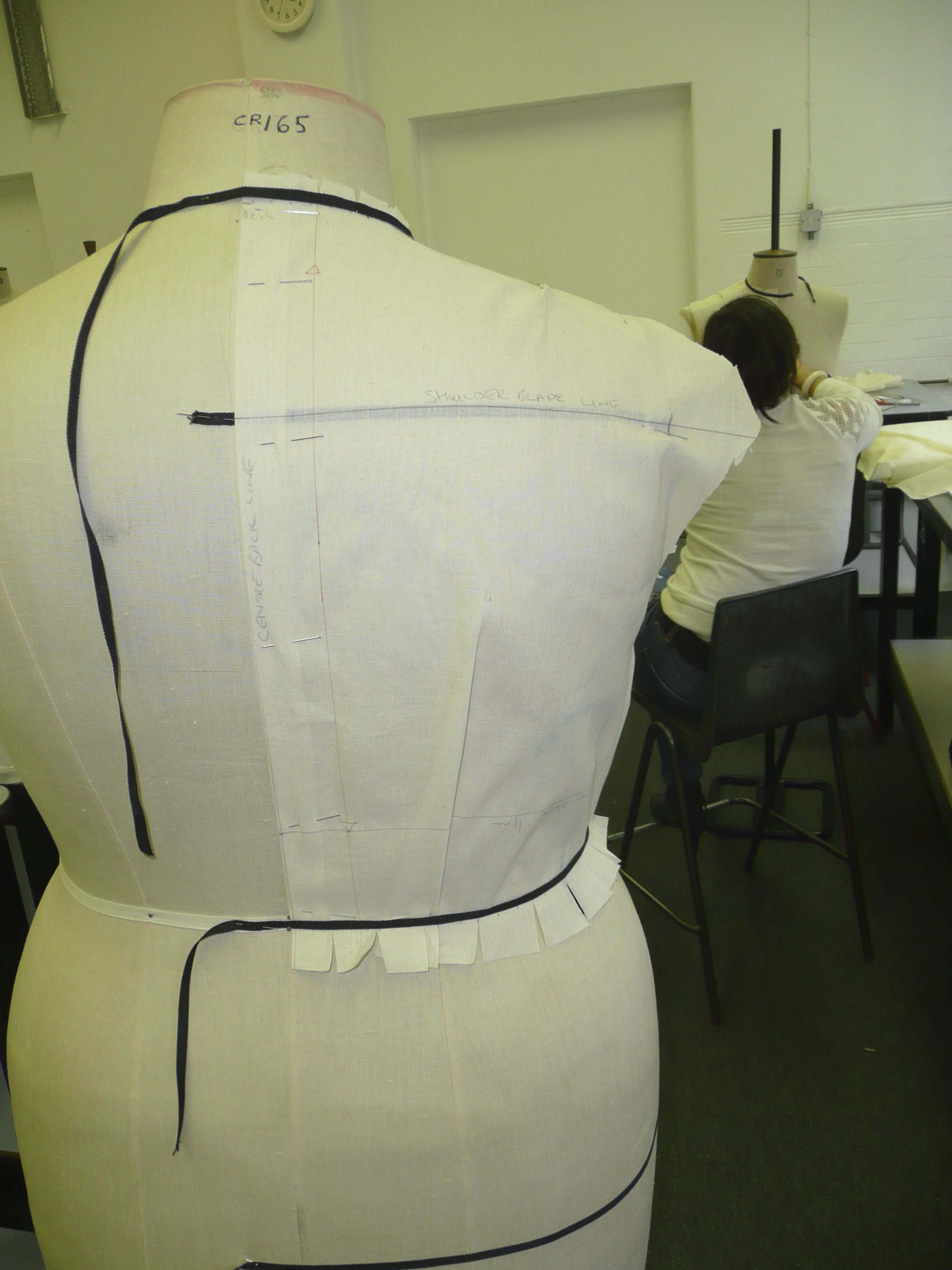 Then we true the work, we make a block, from that we make a pattern, we then toile the work and then pinch away any excess to make the bodice as skin tight as possible and then after altering the pattern and toile, we insert boning into the bodice.