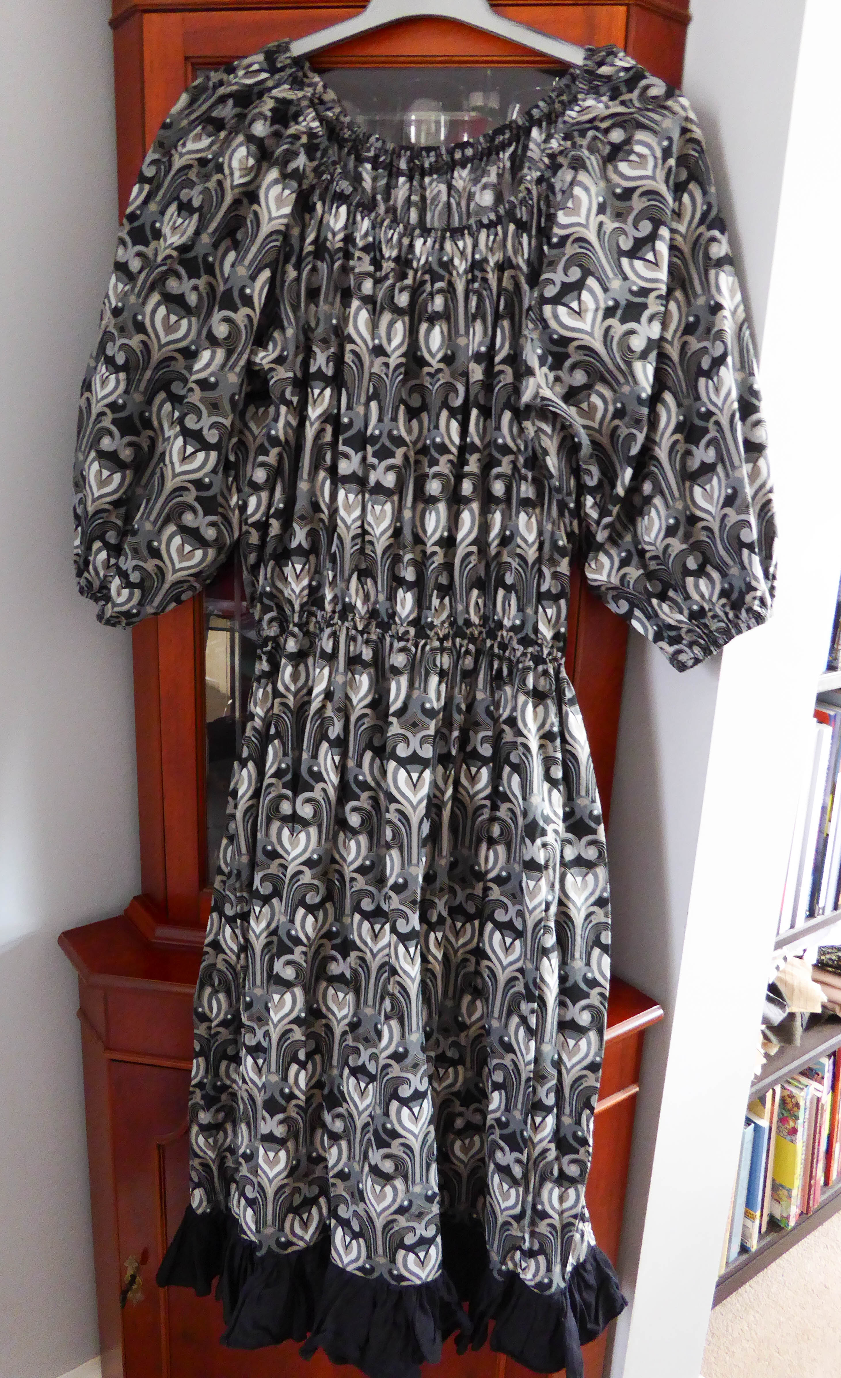 I then sewed up the fabric reminiscent of corinthian columns in a monochrome palate into a dress adding the frill the next day, which was a black cotton we had been given for pocketing, I’m still working on a belt. This was my toile, and from that I altered the pattern slightly to produce another dress in a paisley pattern which is a slightly better fit, but both are definitely wearable.