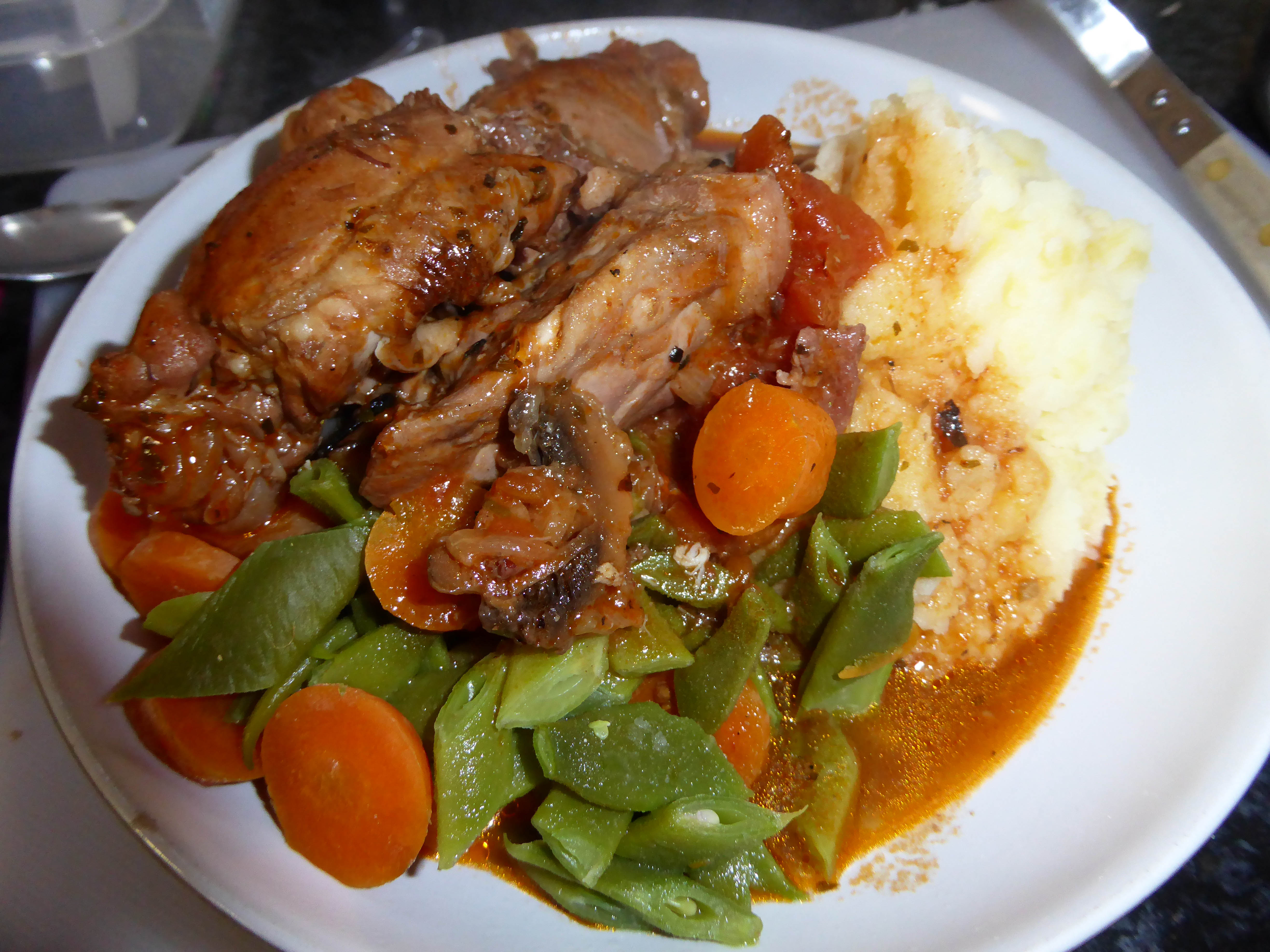 Hubby had been and gone and left just under half a bottle of red. Tempting as it was, I thought of other ways to put the wine to good use. Not least I’d just picked up a very good buy of chicken thighs. So I skinned the thighs and added them to some fried onion, garlic and chopped up bacon, added the wine, a tin of chopped toms, a few mushrooms that were rescued from the fridge and a good sprinkling of oregano, salt, pepper and some water to cover the thighs and let them burble for a bit, about an hour and a half. And during that time I cooked off some potato and swede and mashed it together and cooked some just picked runner beans with a couple of young carrots.