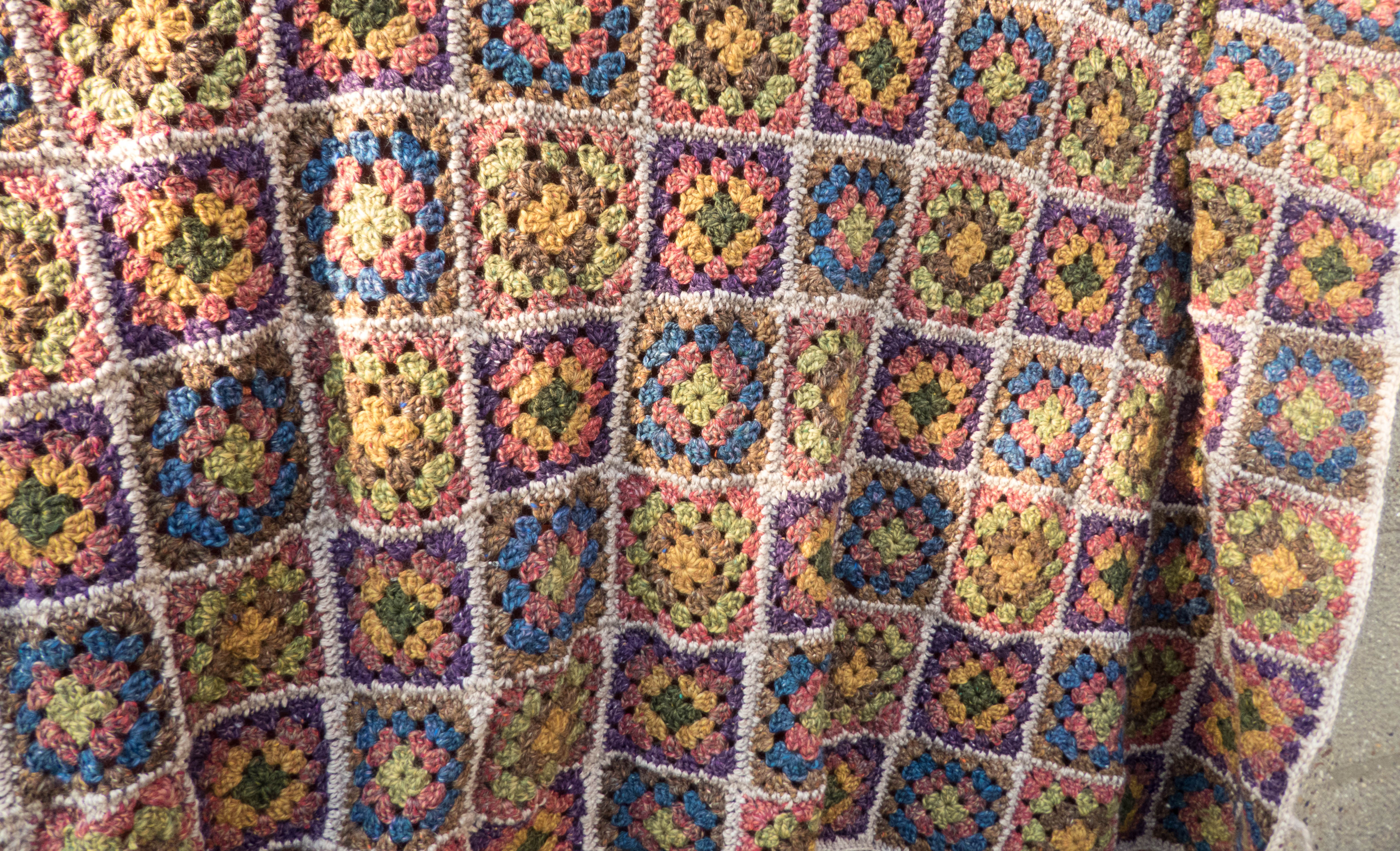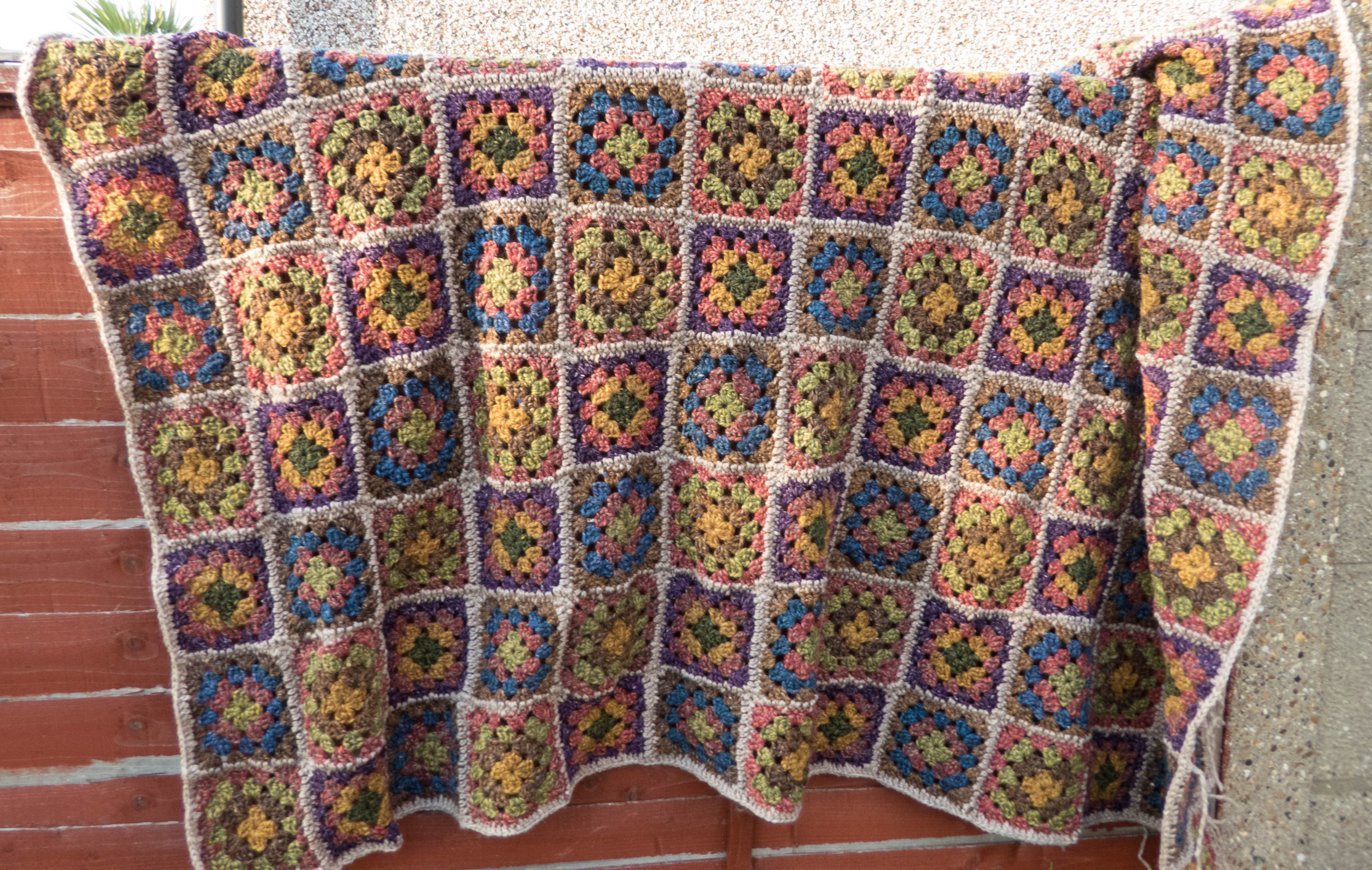 And for those with more of an eye for the pattern, this was made from Rowan Purelife Home, called Granny Squares Throw by Marie Wallin in yarn Rowan Renew. I used two more balls than called for in Trailor 681 and some of the others were short by a ball, but I simply can’t remember which ones, and I crocheted with a 5.00 mm crochet hook.
