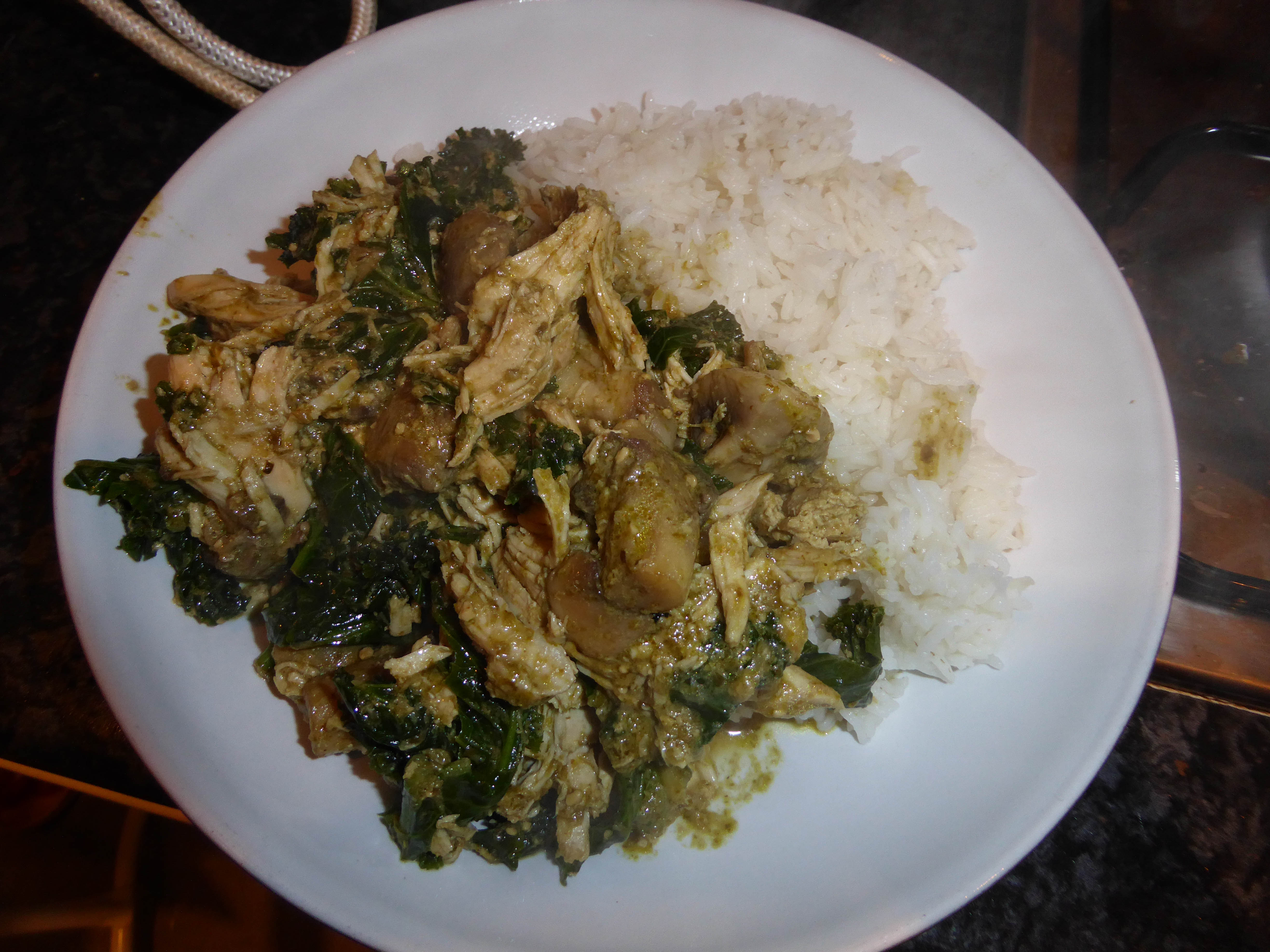 But nevertheless it was succulent and tasty and was just what I needed. Having only one leg missing from the bird I have quite a lot of left overs – its never a problem but it can get a bit samey. So I decided to try a pesto version of a sauce to go with my chicken. I roughly chopped some mushrooms, fried them off, added some cooked chicken, a couple of good handfuls of Kale and added a small jar of basil pesto, whilst trying not to look at the calorie count.