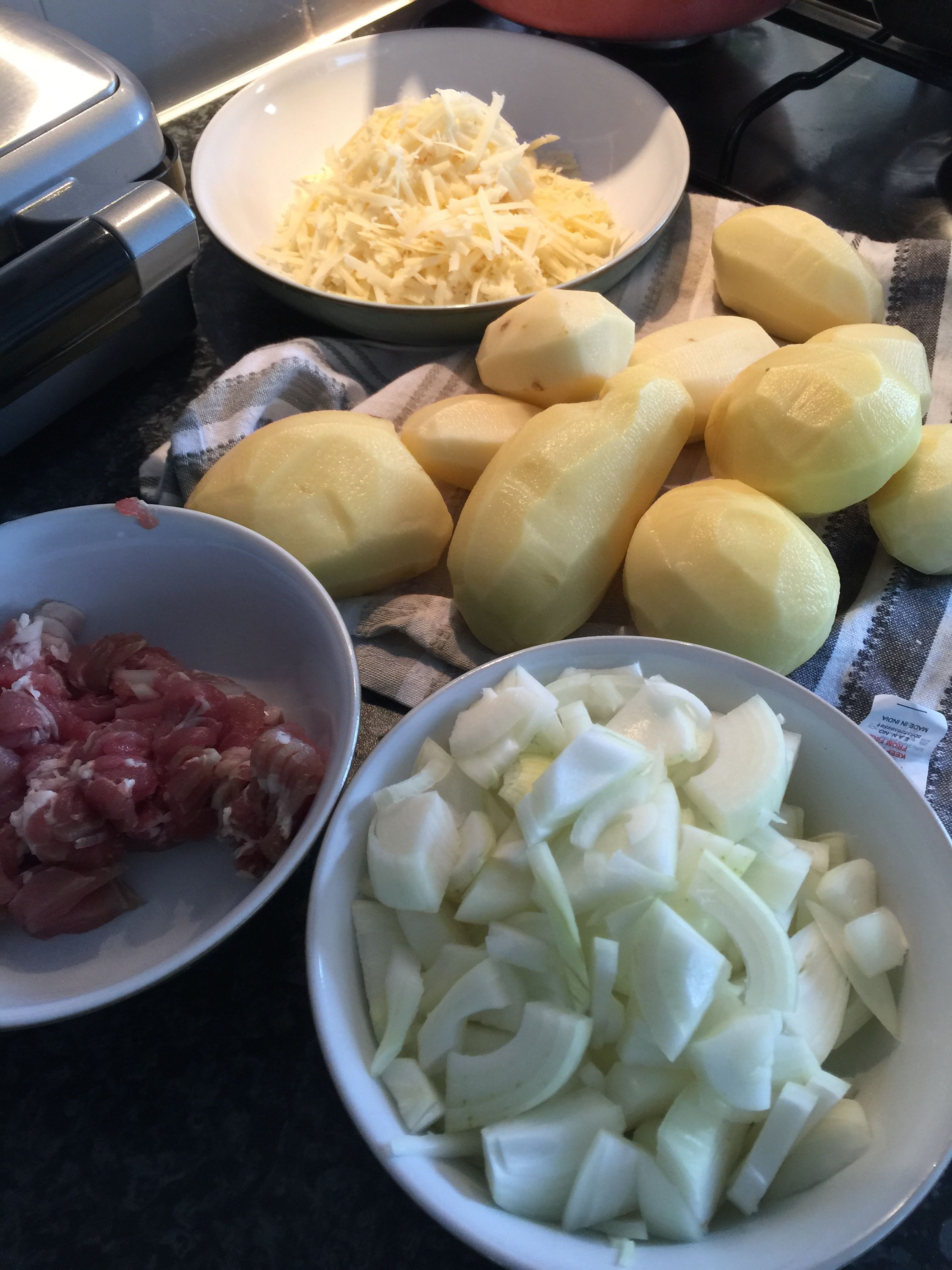 And while my pastry was resting in the fridge, I peeled and chopped the potatoes and onions, grated the cheese and snipped what was left of the bacon. When the pastry came out I evenly portioned it out and rolled each piece into a circle of pasty. I don’t bother using a plate to cut a perfect circle, you can if you like, I am more of a bodge it, feeding a family, country cook and I don’t like adding the pastry scraps together and rerolling them, they’re never the same and you often end up with a tough little piece of pastry which your never quite sure what to do with – and jam tarts weren’t on the agenda. You do end up with odd sized pasties, but I don’t think they are any the worse for it. I then brushed them with milk and popped them in a moderate oven, turned down after twenty minutes for fifty minutes.