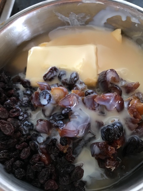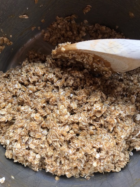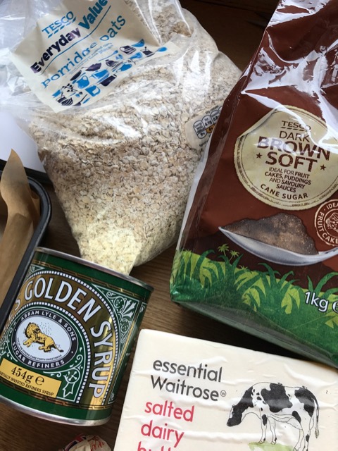 Butter, brown sugar, golden syrup and oats. Weighing all the ingredients to Martha’s recipe, mine being long since forgotten,