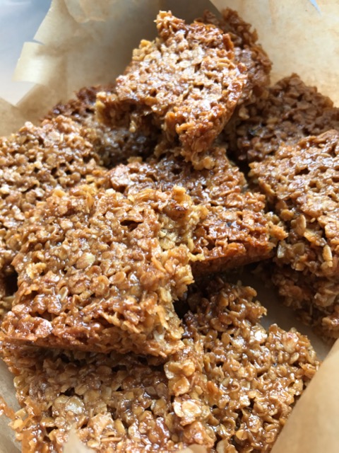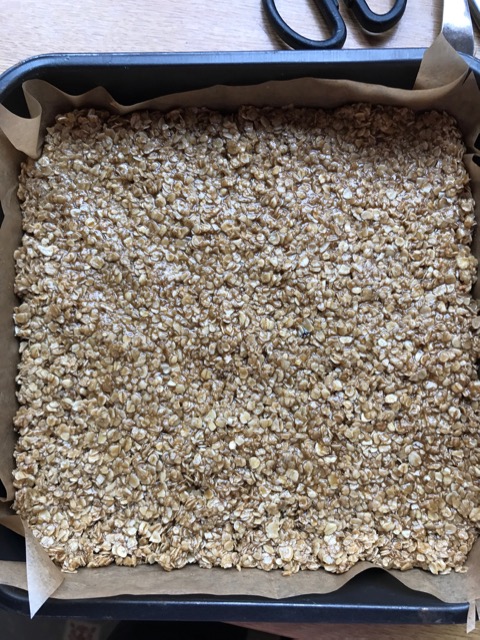 I was having a lovely few moments flicking through Martha Collison wonderful book on baking called Twist making mental notes about cakes I would like to try but don’t at that precise moment have all the ingredients to bake them with, when Flapjacks hit me square between the eyes. ( Although I am getting much better at the buying of the ingredients, now I make a mental note and then place the cookery book that is involved in the execution of that weeks cake on the table by the laptop so when I do the weekly online shop, I can flick to the page and order the ingredients, it works like a charm. No more trudging around a supermarket racking one’s brain thinking ‘what was that item I needed?’) Oooh Flapjacks, those buttery, crunchy yet soft and chewy, sweet and sticky treats, what is not to love. I’ve been making flapjacks for nearly 50 years, firstly at my mother’s aprons strings, then in school cookery classes, next in various lodgings during cold winter nights and onto feeding hungry boys during summer holidays, although then they would barely last the day, but not recently and they only take four ingredients.