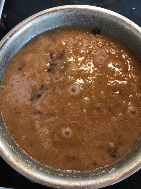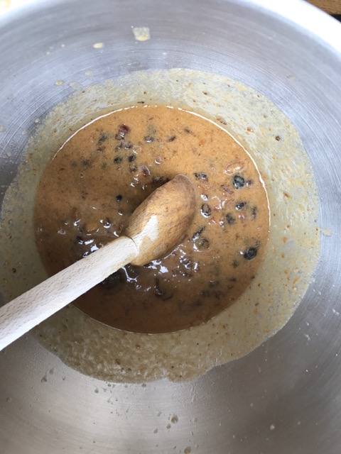 Then let it cool for half an hour which is vitally important. The raising agent in this cake is bicarbonate of soda and this works by releasing gas as it warms up, through heat. So if you mix the dry ingredients into a warm hot sticky mess the cake rise will happen while you are still mixing it in the bowl and not as you want it baking in the oven.