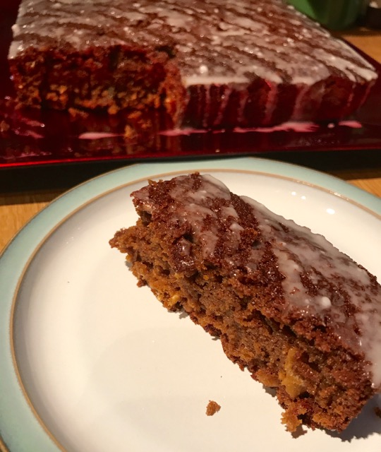 then enough icing sugar and lemon juice to make a thin glaze to finish the cake with, put the kettle on, cut a slice and watch the snowflakes swirl whilst enjoying the gingery cake with lemon icing high notes along with a small addition of a nutty texture, it was quite interesting.