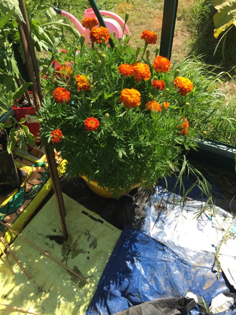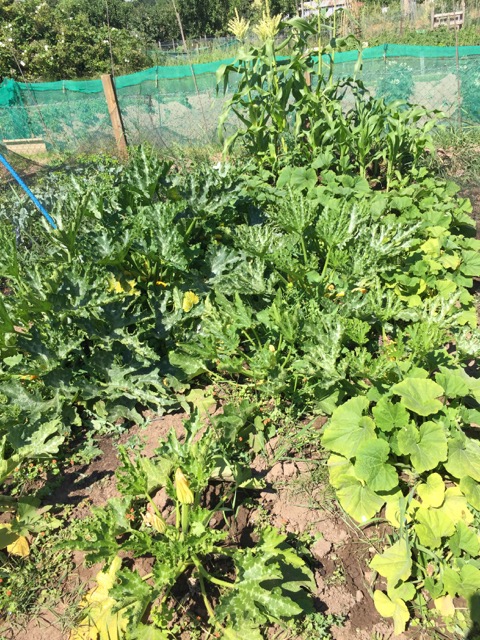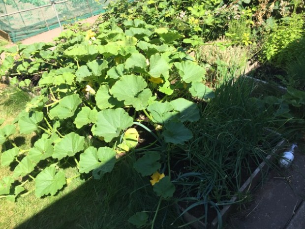 This is the courgette and butternut squash patch with sweetcorn at the rear. The courgettes are going great guns, I’ve had to ask hubby to slow down on the watering as this home cook is not keeping up with the glut. I could make chutneys etc, but its just too hot to enjoy making it.