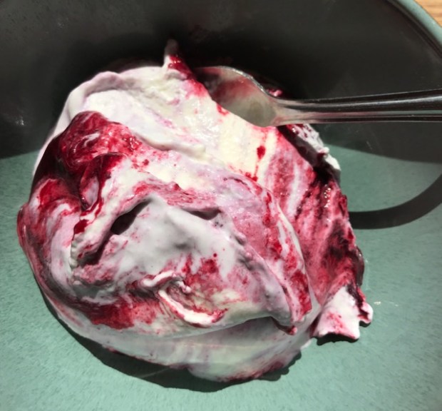 And now we are eating an unseemly amount of this, the most delicious blackcurrant ripple ice cream you ever did see.