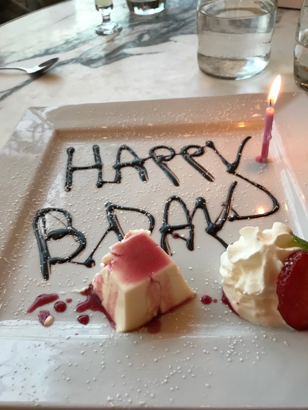 While we were relaxing having taken our time to order a dessert, this appeared. It was so cute and so unexpected, I loved it, and just as we were sharing it a round of “Happy Birthday’ struck up from a choir of seven that had appeared from behind me, a rousing chorus of melodious Italian men and women’s voices, headed up by the Manager that I had met earlier. They were very impressive and as they finished the restaurant erupted into cheers and whistles. It was brilliant. I was blushing as bright as any beetroot, but I did love it so.