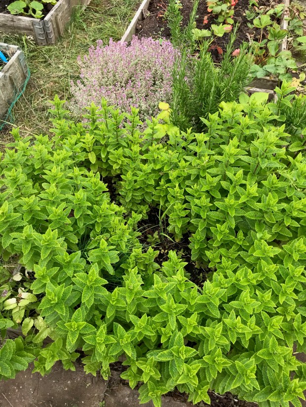 Our mint is doing well, for the first year it is outstripping our notoriously high demand. Flowering thyme behind that and some rosemary. In another bed we have the most tasteless strawberries you ever did meet, I’m looking for a new variety for next year, if anyone has got any hints and tips on that I’d appreciate it.