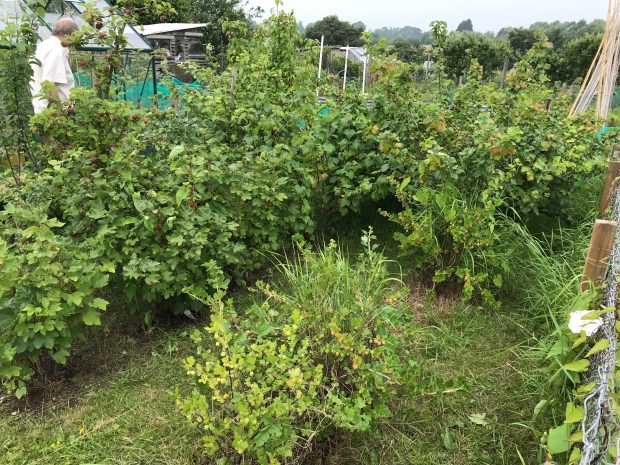 The fruit patch which has goosberries, red currants, black currants, blueberries, two apples and one pear tree.