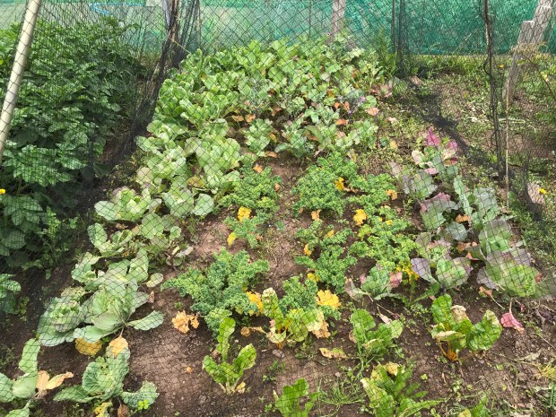 The brassica’s. Oh so much here. Cabbages both winter and summer and cauliflowers, kale and brussel sprouts, chard and broccoli and purple sprouting. It will thin out as the summer goes along as we eat the summer cabbages and the early cauliflowers.