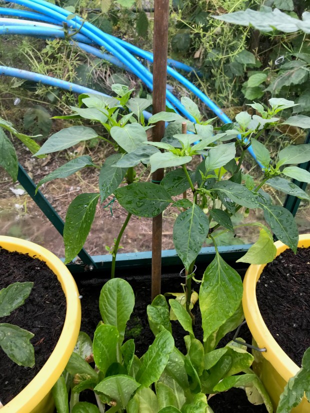 Cucumbers are in the corners. One in a pot one in the border, it will be interesting to see which does best.
