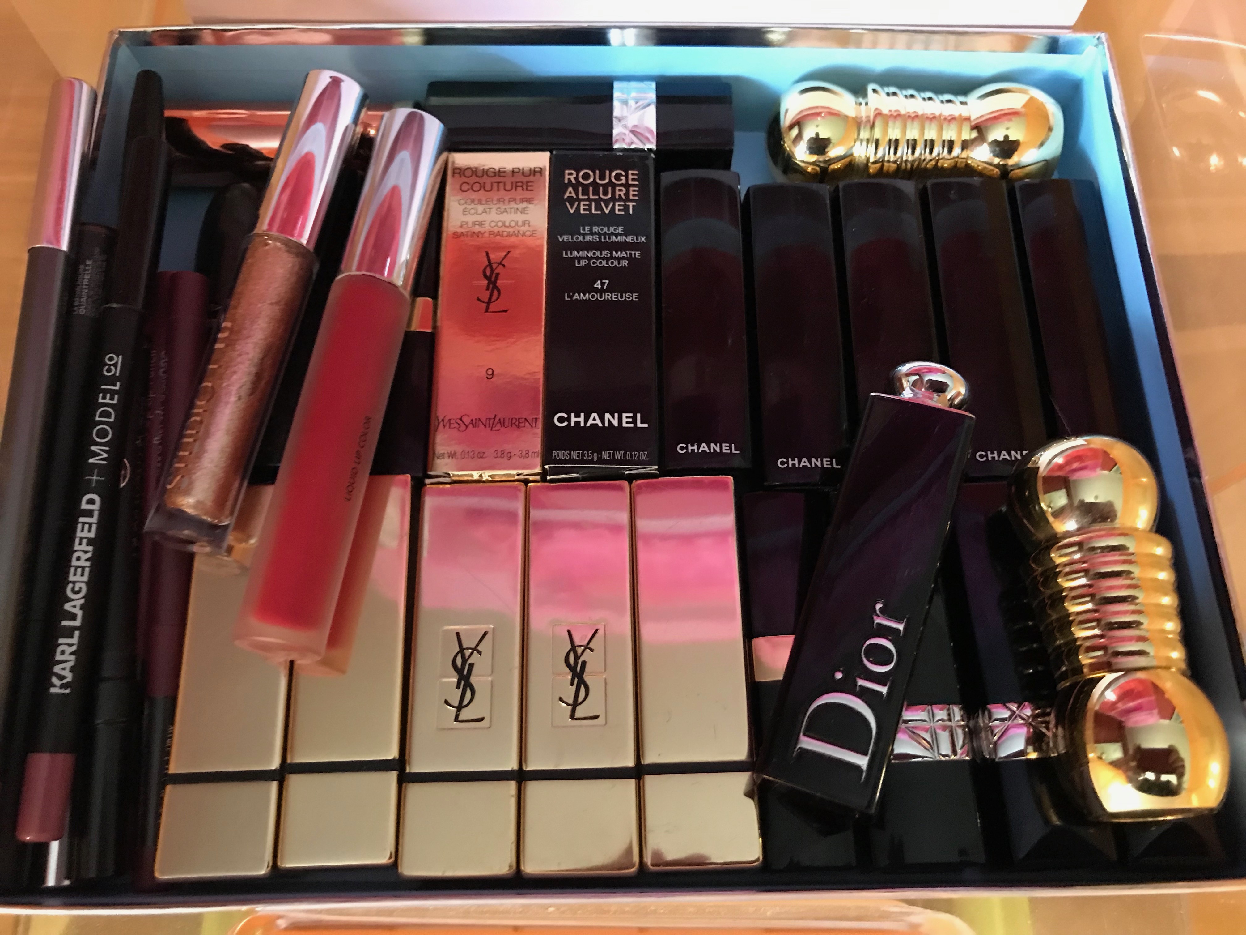 Well, the lipstick habit has progressed, it now includes…expensive eye palettes, foundations, blushers, eye pencils, lip pencils, cleaners, toners, serums, face masks, moisturisers, hand creams, body creams, bath bombs, etc, etc, etc. Enough I should think to last me a year, or even two.