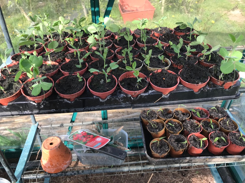 Peas and Mangetout are coming along. I’ve poked extra seeds into the pots where they haven’t germinated and the chilli’s that I started rather late on the window sill at home have been transplanted into individual pots. 15 chilli plants poked amongst the tomatoes should see us in chilli’s for the year.