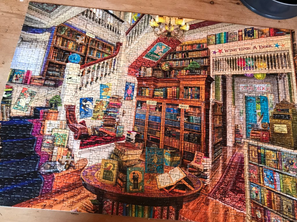 Is there anything more satisfying than spotting the right piece to slot into a jigsaw puzzle. I don’t think so. You might notice that there are two pieces missing, that is because two Christmas’s ago one puppy dog called Rupert took a liking to the jigsaw pieces and munched a couple, so we had to put it away not realising that two had disappeared! So we never got the satisfaction of that final click as you put the last piece in, but it doesn’t matter. Hubby and I started this particular puzzle, hubby and son no.2 did large chunks and then son no.2 and I stayed up very late one night and had a marathon session on it, with much banter and laughter along the way. We left it in one piece to surprise hubby, I’m not sure if he was pleased or disappointed that he didn’t join in the fun. I’ve bought him a couple more jigsaws which includes one of London. Oh the joys of Lockdown!