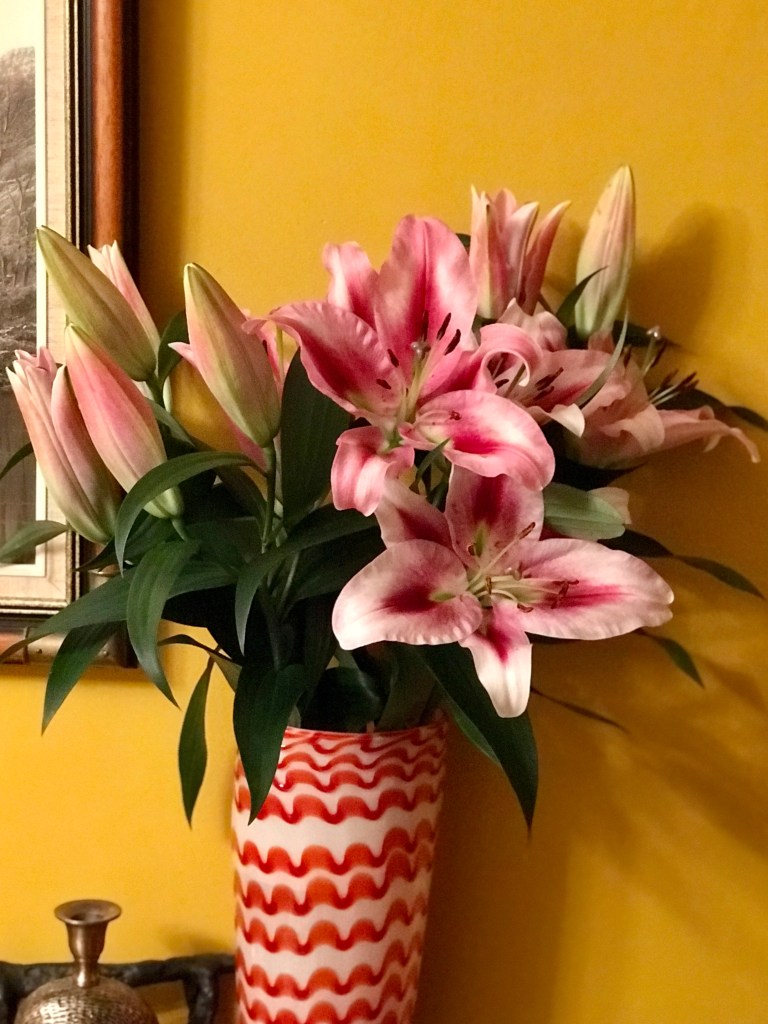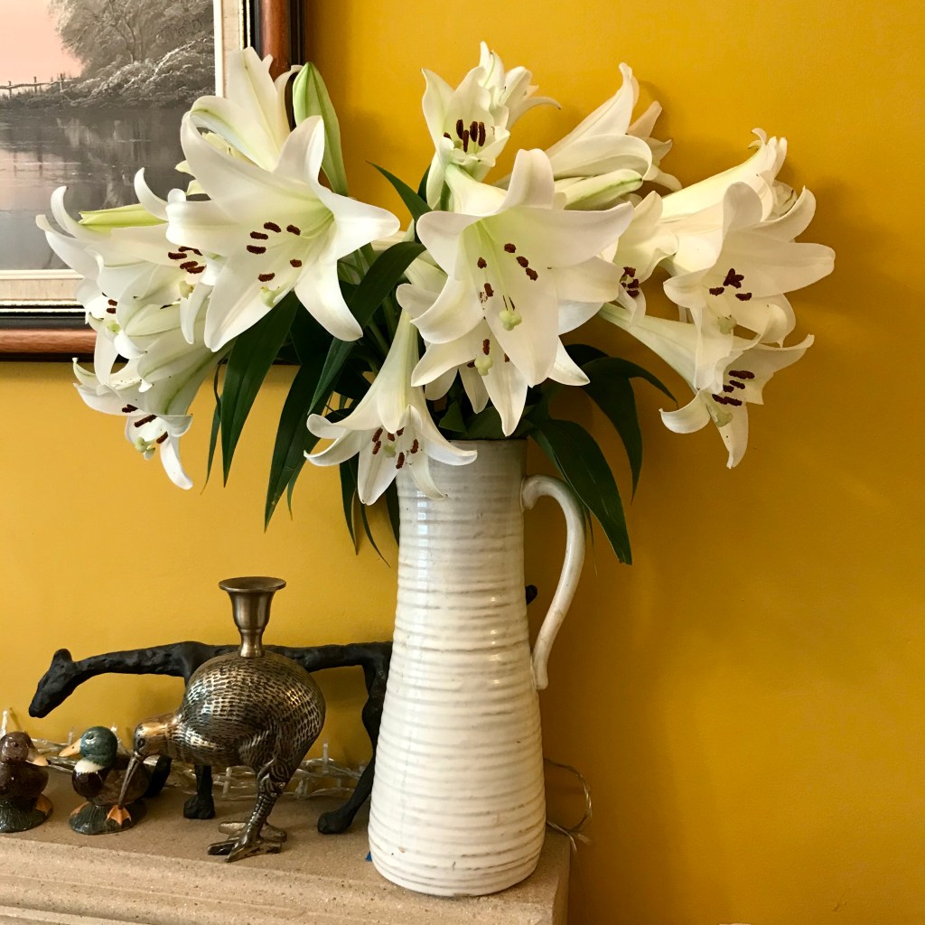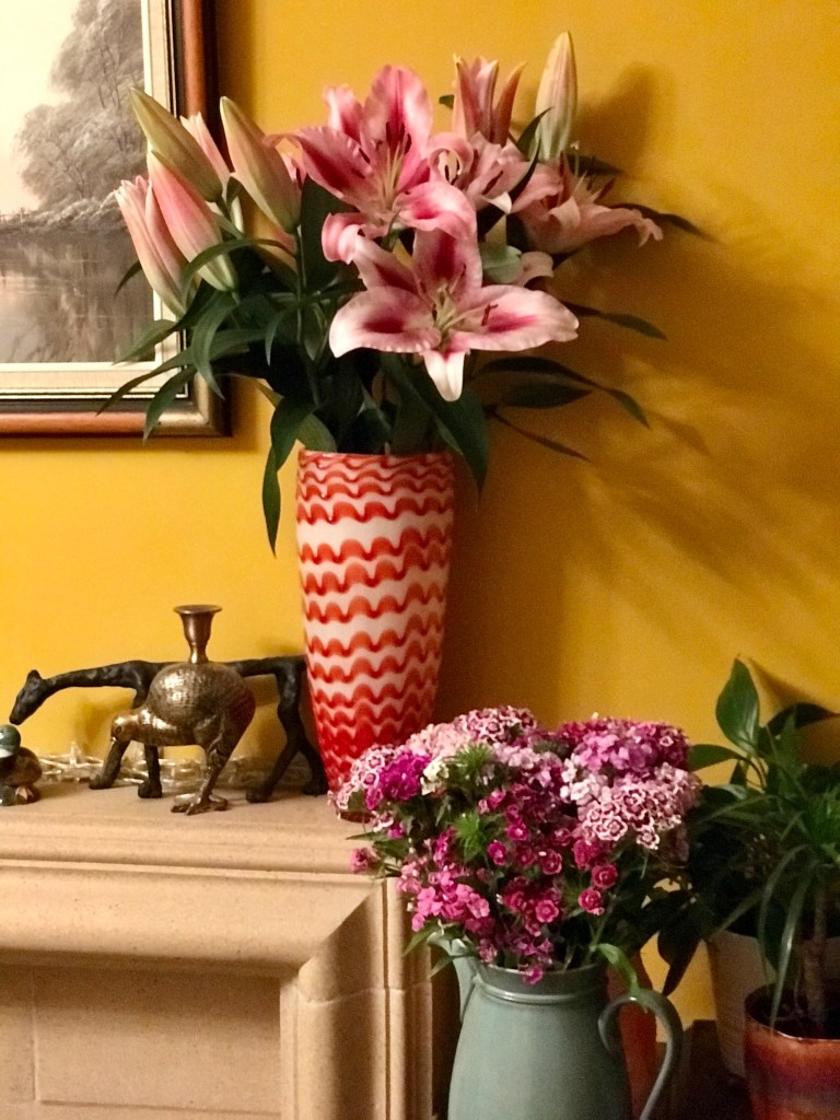Remember the lillies a week or so ago, those small green buds, even I was worried that they would not bloom. So after a week or so, I resnipped their stems, fresh water and food and out they popped. Lillies give such good value for money don’t they and I love their perfume, it scents the whole room. The only downside, as I was reminded by my good friend Jenny, their toxicity to cats, lethal they can be. It’s always good to have a reminder to things like this.