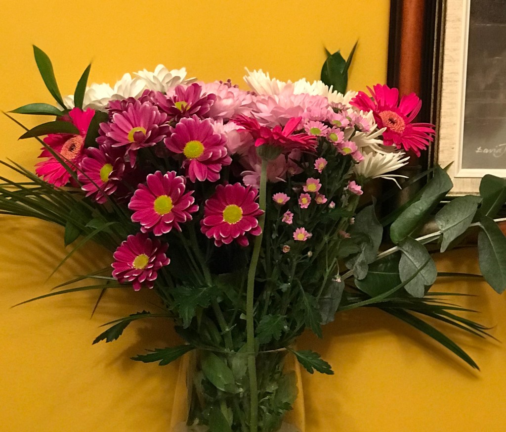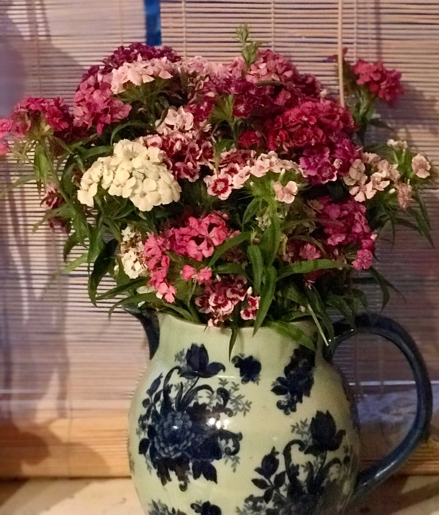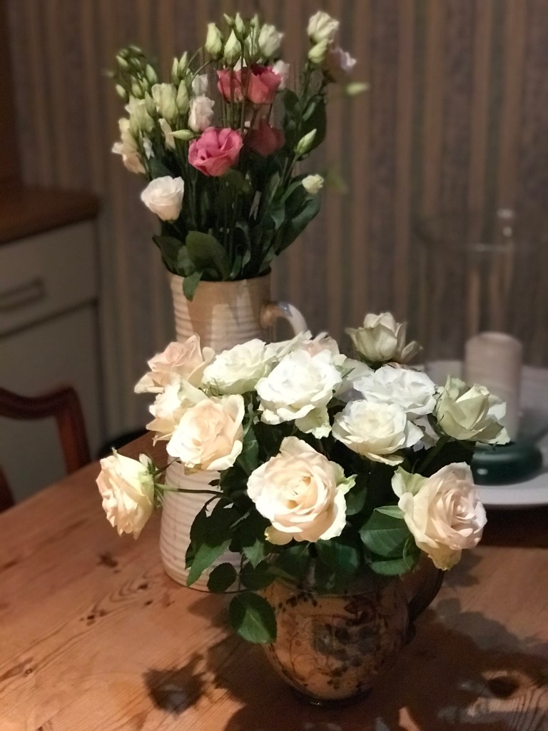 Please excuse me whilst I immortalise my birthday flowers. Some were bought for me, some I bought myself, all apart from the beautiful flowers next to the roses are at least a week old and all are supermarket flowers, which I make no apology for, supermarket flowers have improved incredibly in the last twenty years or so, and they are so affordable. I remember watching a documentary about the huge auction houses that exist for flowers, it’s totally computerised and is a huge business, quite fascinating.