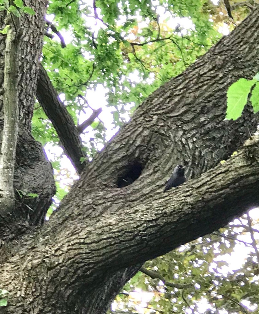 And found two jackdaws nests and spotted a woodpecker. The jackdaws are doing really well, looks like there may well be several nests. You can just see a parent bird and a tiny beak poking out of the hole. I’m going to need my proper camera.