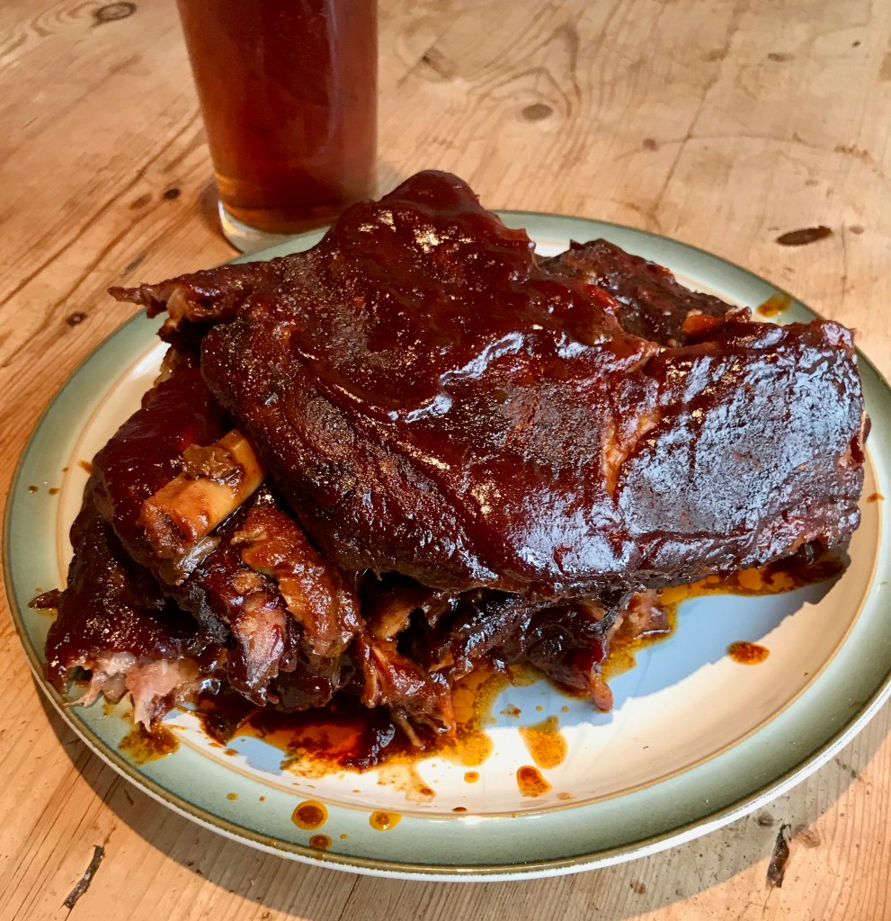 We started with ribs. These had been slow cooking for about five hours by this point and I finished them with a barbecue sauce.