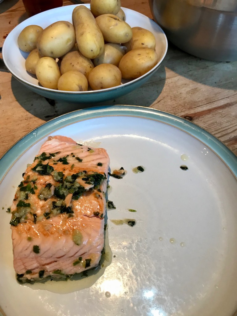 Next, pan fried salmon basted with a coriander and garlic butter served with lovely new potatoes and salad. It was perfection.