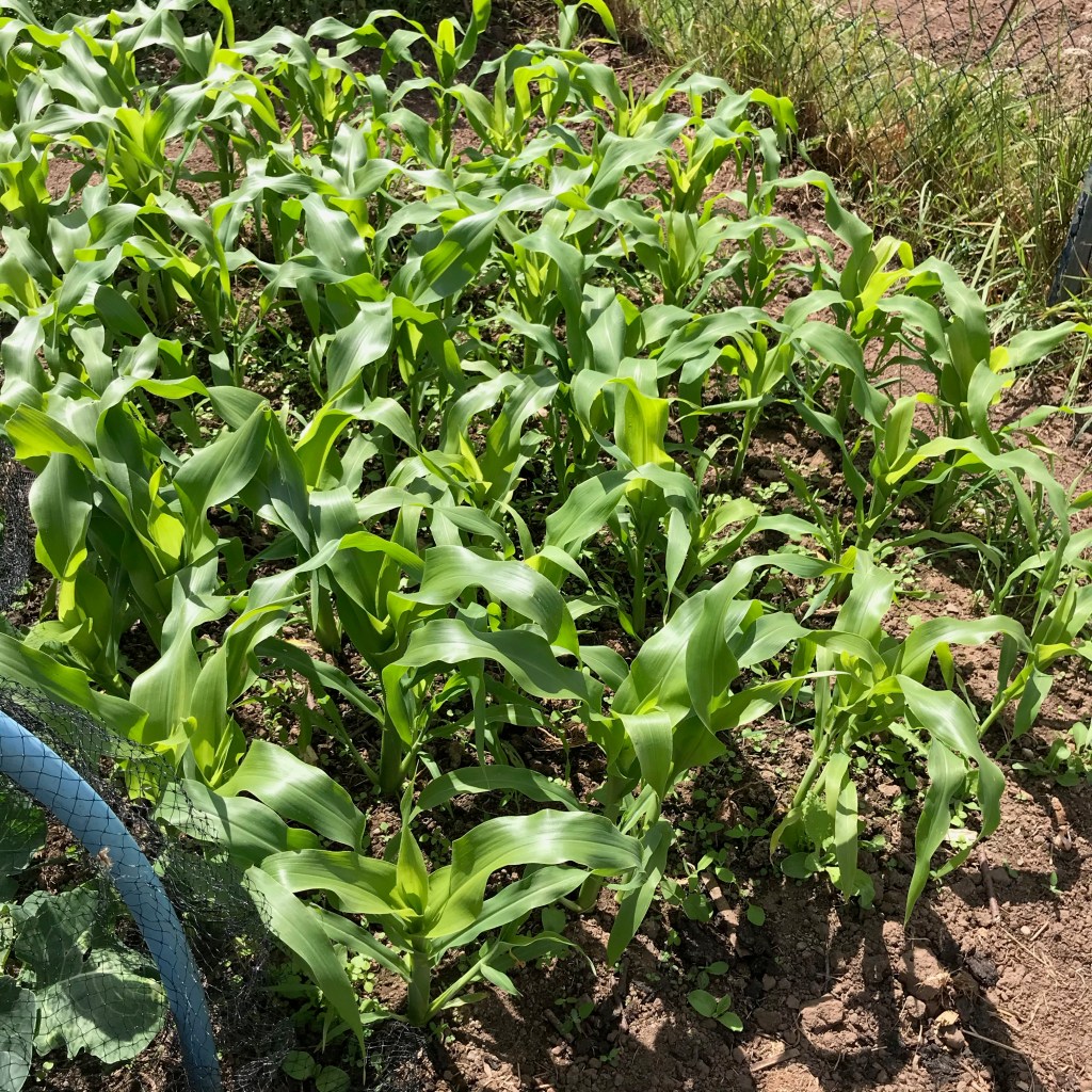 We have a swathe of two varieties of corn on the cobs, which will do very nicely when they are ripe. There are never any wasted!