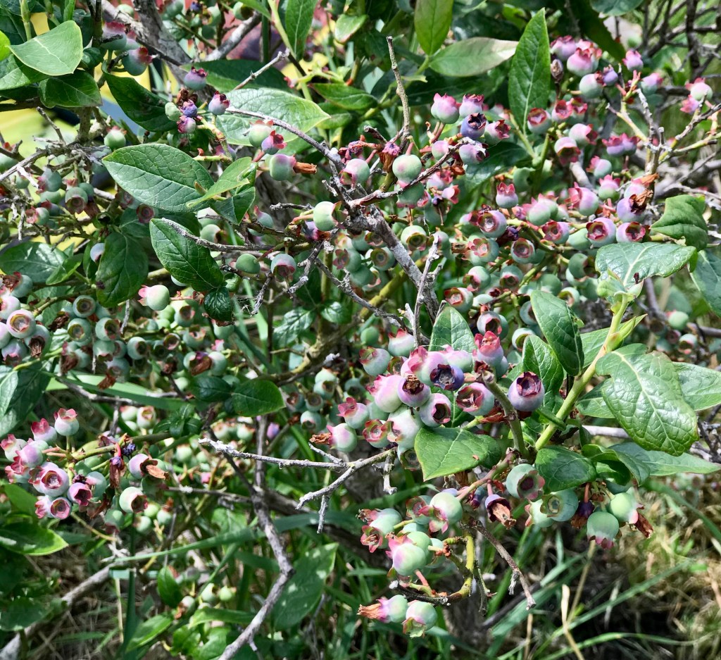 The blueberries are having a field day. We only have one tiny bush, it must measure less than a metre tall, but boy is it loaded with berries this year. It must have enjoyed the compost we put on it in the autumn, must remember to do that again.