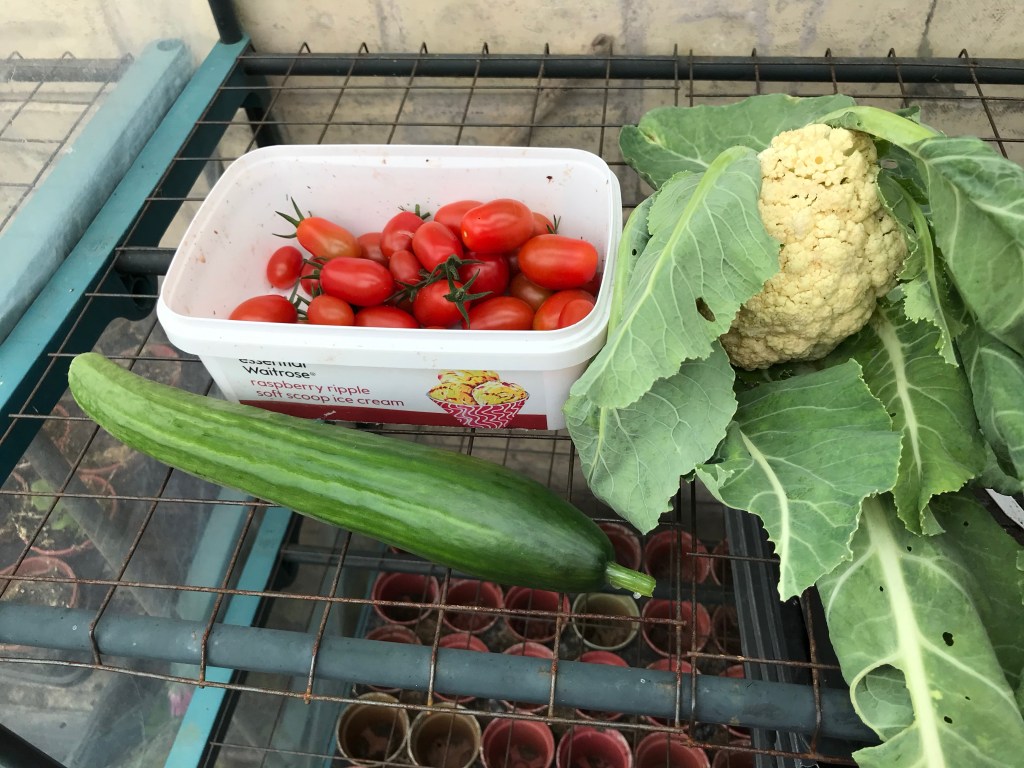 I did find a cucumber, it was staring me in the face when I went back into the greenhouse, which I picked along with a few tomatoes and that lovely little cauliflower for our Sunday lunch.