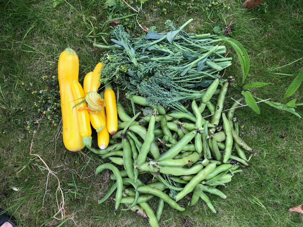 I had hoped to be able to pick the broad beans as we go along, but the black fly have put paid to any smaller pods ripening and these would have only been a few pods at most. A few black fly seem a small price to pay for home grown organic veg. I’ve only recently found a love of broad beans, one of the few vegetables that I disliked as a child, unless they were the first pickings, when they were tiny tender beans. I just remember the chewy strong flavour of beans that were probably just past their best. From the couple that I nibbled on raw at the plot, these should be a delight and I’m looking forward to cooking them gently and serving them simply to enjoy their true essence. Also I have a few beans left and I may well just push a few into the ground to see if we can get a late autumn crop, nothing ventured, nothing gained, as they say.