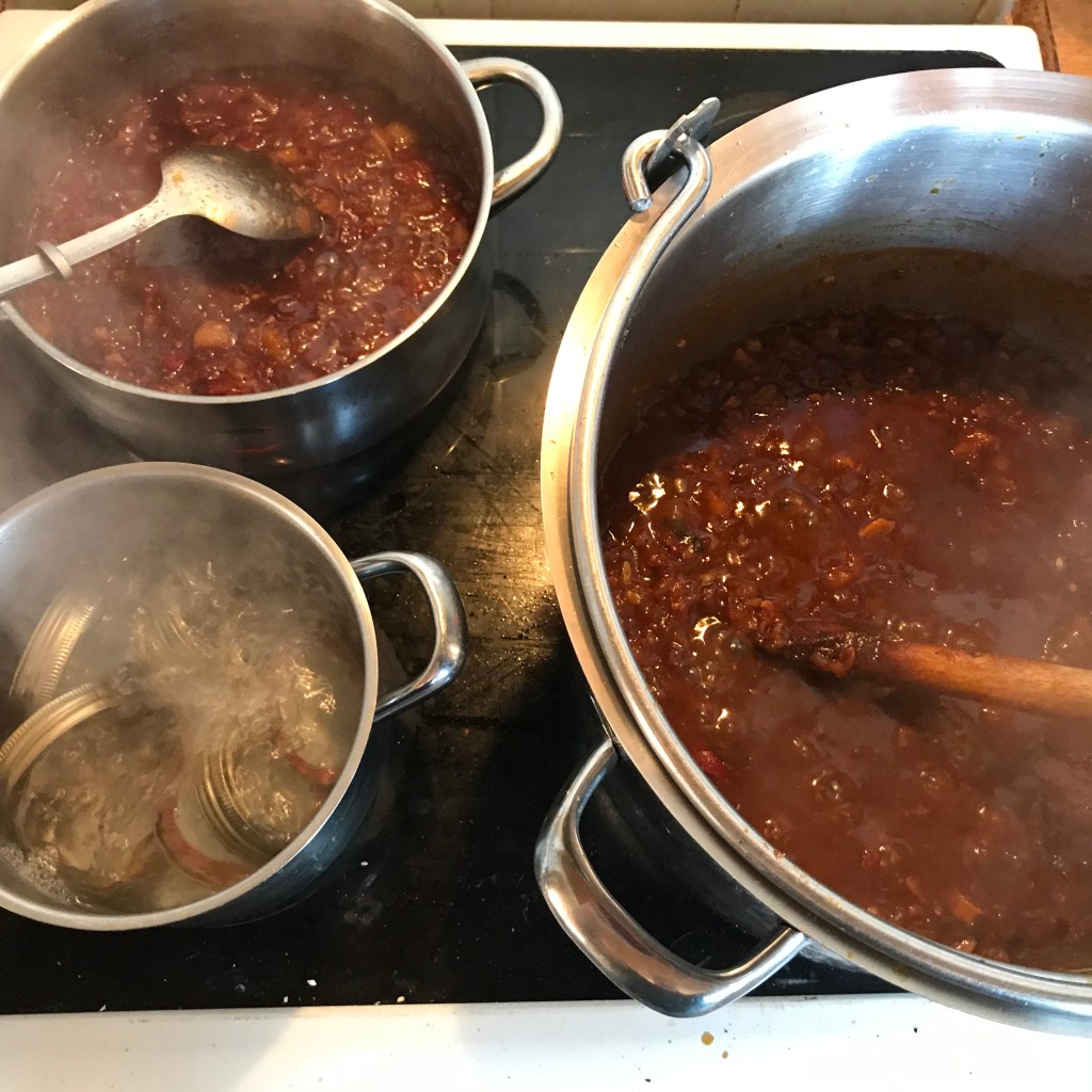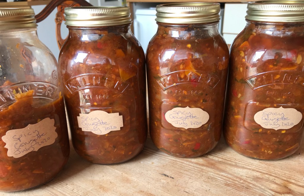 At the moment I feel like I want to potter in the kitchen in the evening. I feel like it may be connected to the grief. I don’t want to sit and knit or sew, too much time to wander off daydreaming to find myself upset again, reading books can trigger memories as well, and I just can’t take it at the moment. But cooking immerses me completely. But there is only so much cooking you can do, Dad is getting well fed at the moment with roast dinners and cakes whipped up quickly in the Kenwood at nearly midnight. So my attention has turned to creating preserves out of all of our lovely veg from the plot.