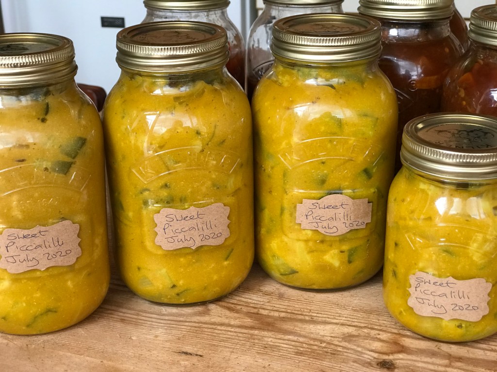I decided to make a batch of sweet Piccalilli – and I know it is going to be so good. Actually a piccalilli is reasonably quick to make, just a bit messy and you do need some good sized pans and colanders.