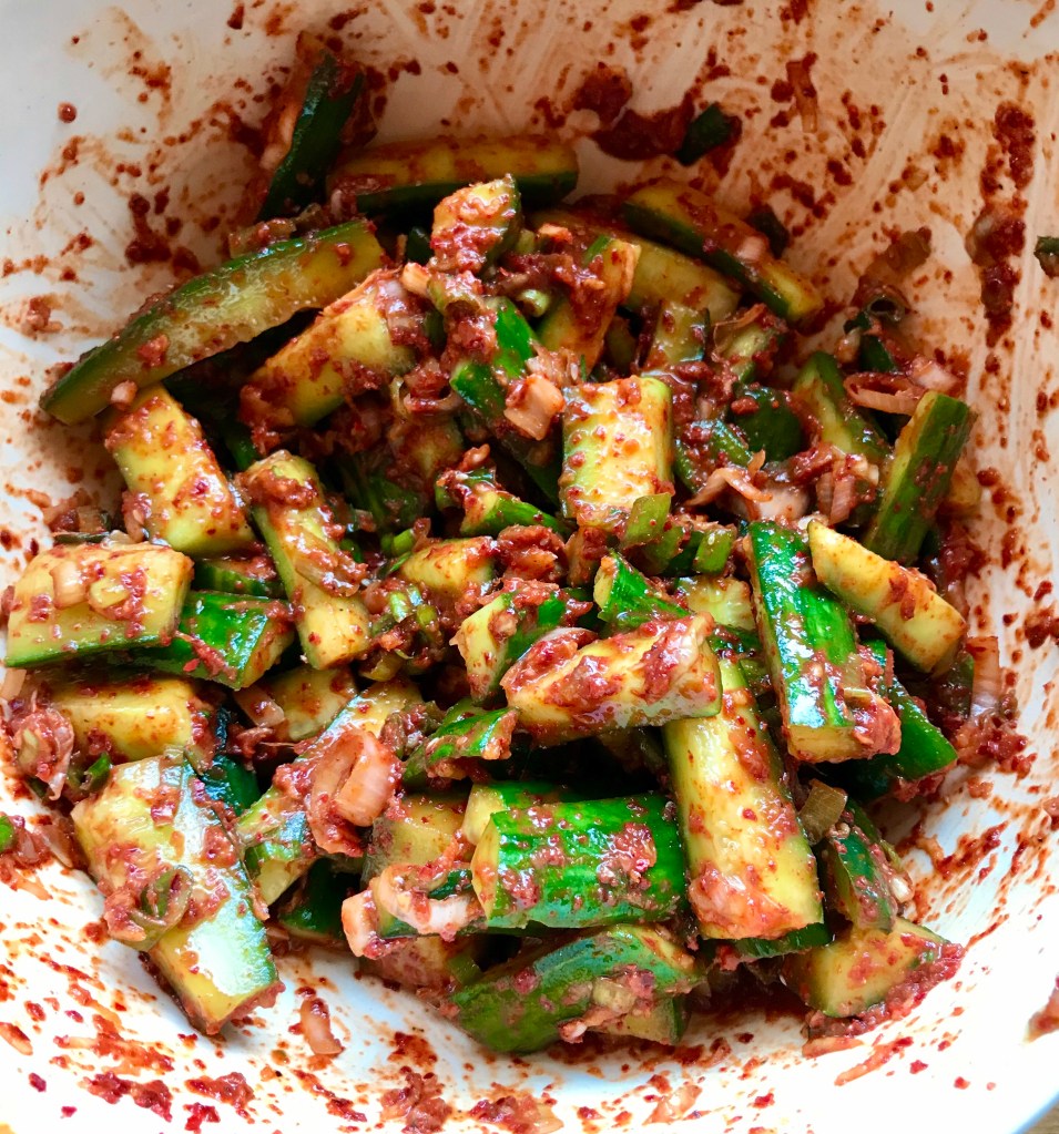 Having tried Kimchi in various restaurants over the last few years and always enjoying it, I thought I might start to make my own – and then a glut of cucumbers appeared, so I ordered some Korean chilli powder and dried fish paste and googled recipes.