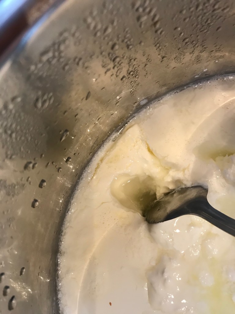 Firstly I scalded the milk and then let it sit for a couple of hours to come back to room temperature, whisked 3 dessertspoons of yoghurt into it and put it into the instapot and hit the yoghurt button and walked away.