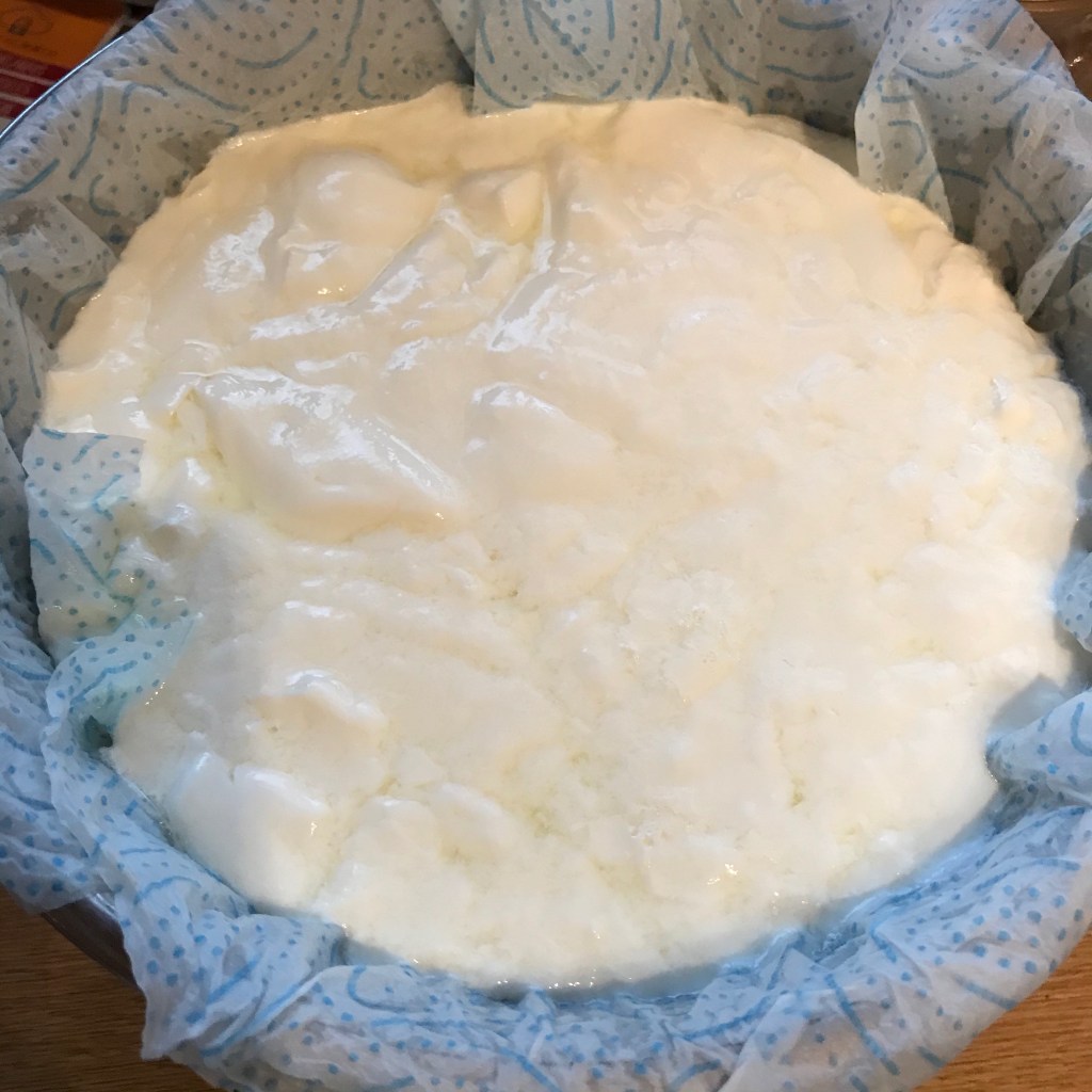 Next I separated some kitchen towel, scalded that with hot water and lined a colander with it, then poured the yoghurt into it and allowed the whey to drain. I didn’t do this for long, maybe half an hour, I think you can strain it for a lot longer to make a very thick yoghurt if you wish to.