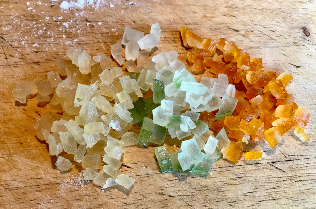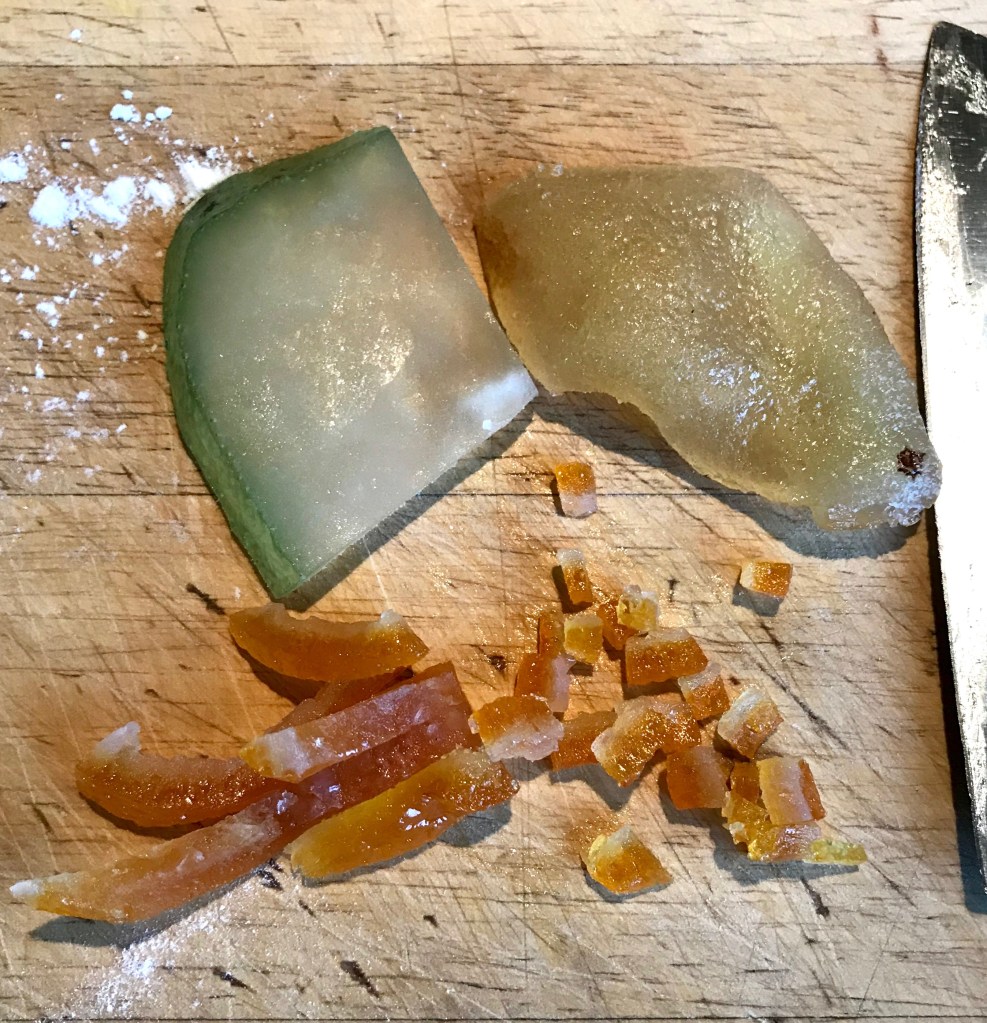 Next I had purchased the first of the seasons candied peel up at the market, so portioned about 75g out and chopped that up into tiny jewels.