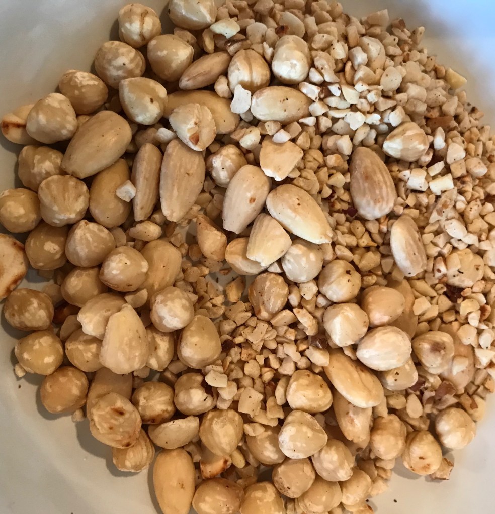 Firstly I pan roasted a collection of nuts, almonds, hazelnuts and chopped mixed nuts that I had in my collection. The recipe indicated oven roasting but I think pan roasting is much more controllable and there is nothing more disappointing or expensive than forgetting for a moment your nuts that are roasting in the oven and finding them too far gone and slightly blackened and bitter.